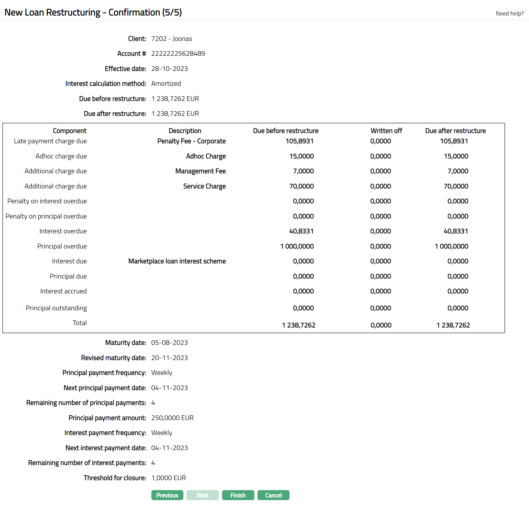 - Click Next. New Loan Restructuring -- Payment Terms (4/5) page appears.