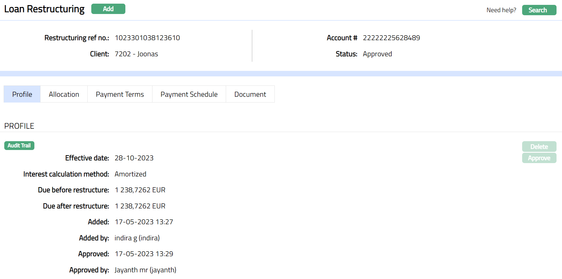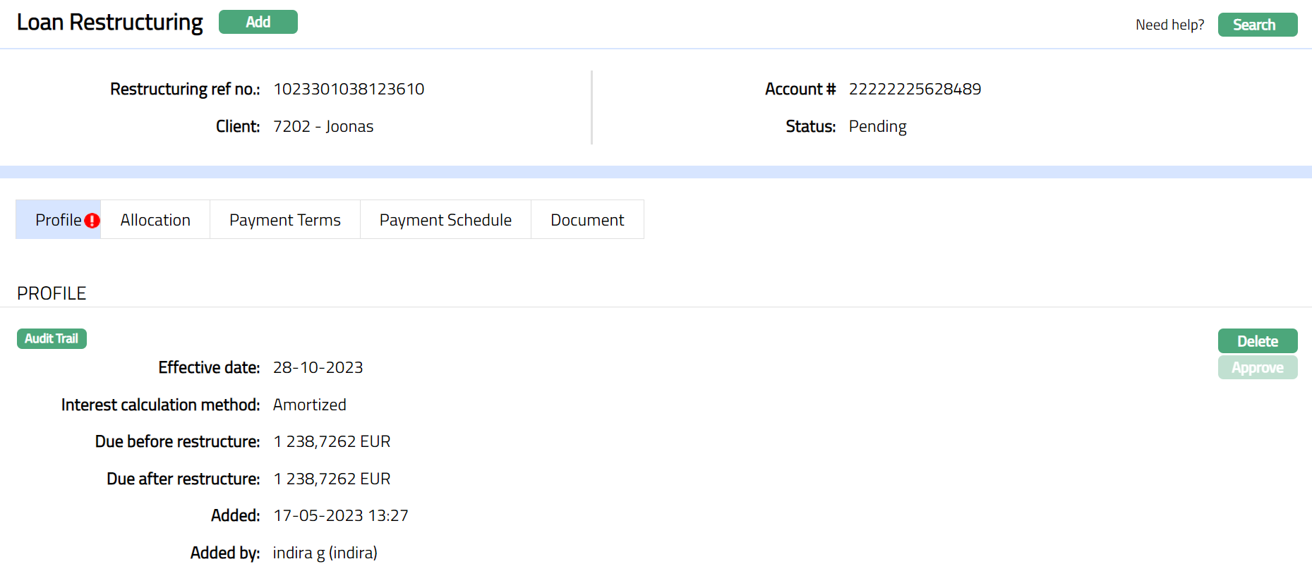 Note: Status of the Loan Restructuring will display as Pending. Once Profile tab is approved by another user who has not created the record, the status will display as Approved, and the red bubble will disappear from Profile tab. Sample screen shown below.