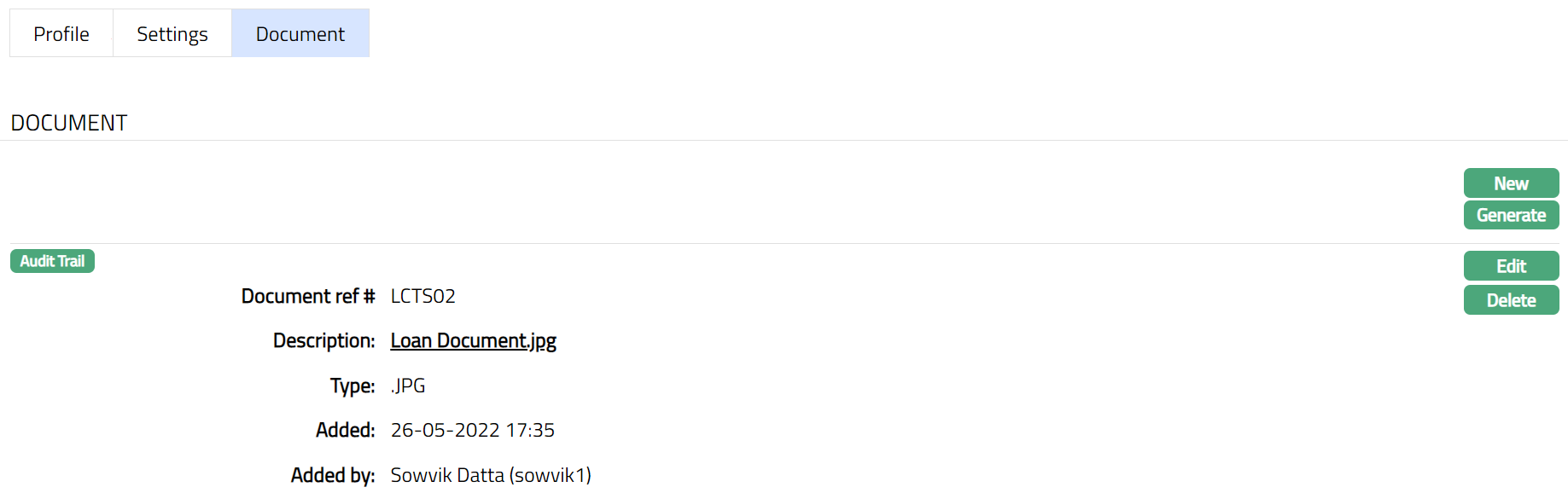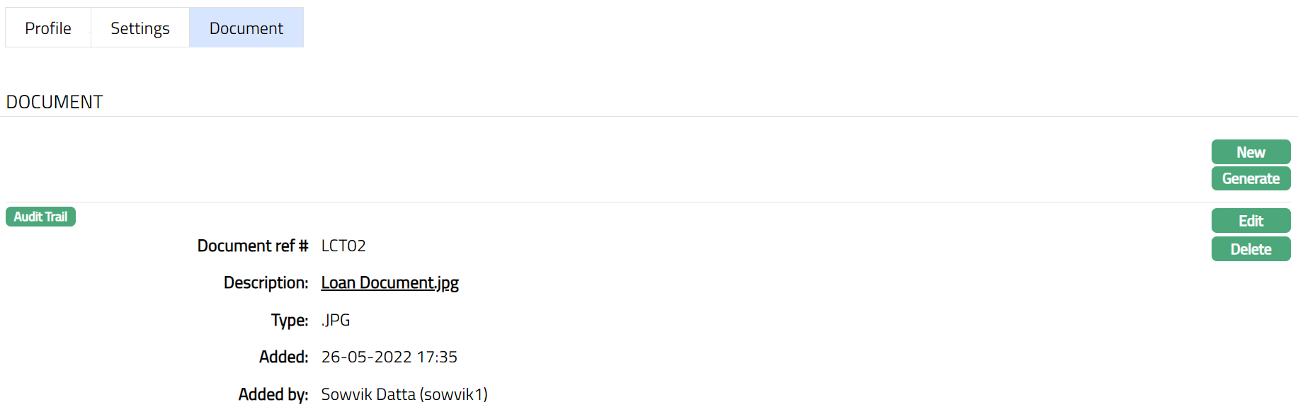 Click Save. The Document page appears with the added details.