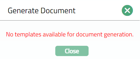 - Click Generate to generate a pdf version of the document by selecting from a list of templates available for manual loan disbursement. Note: The Template need to be defined by the user.