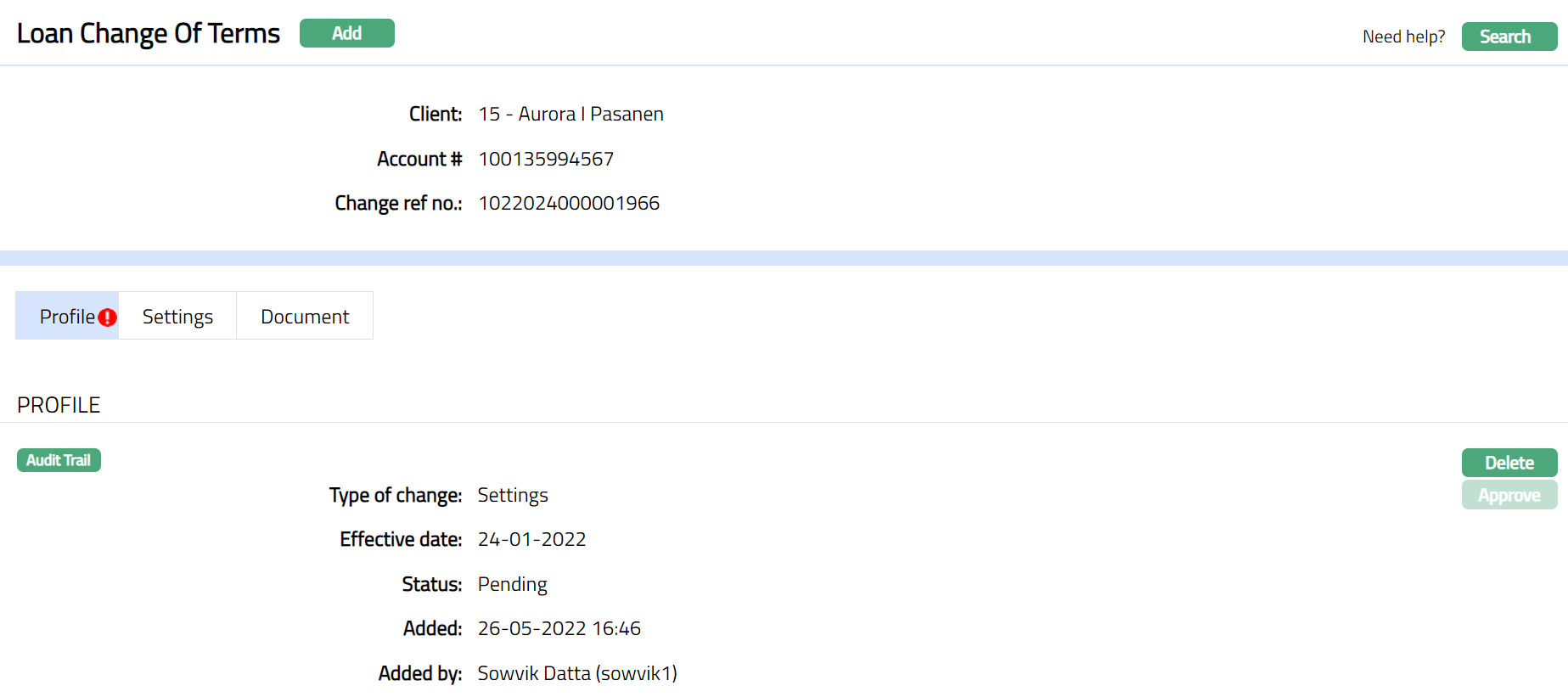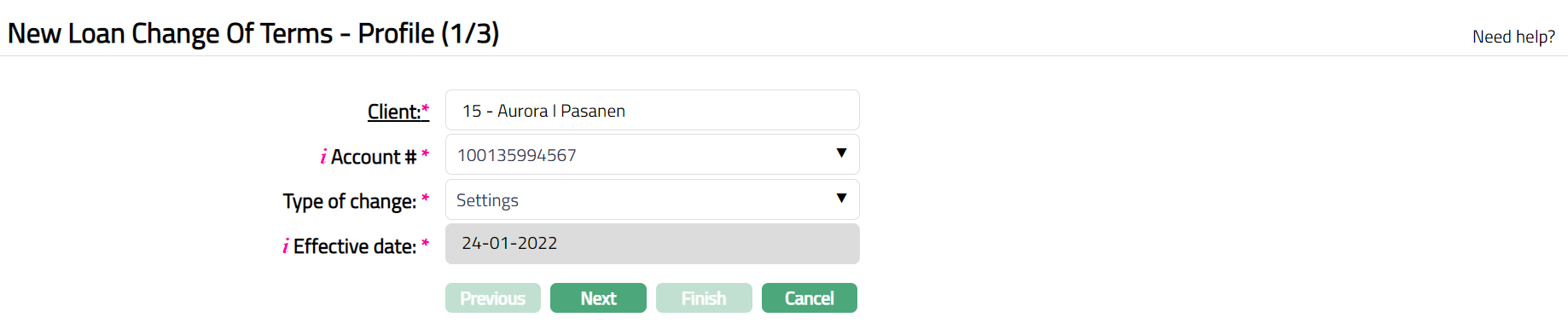- Click Add. New Loan Change Of Terms - Profile (1/3) page appears.