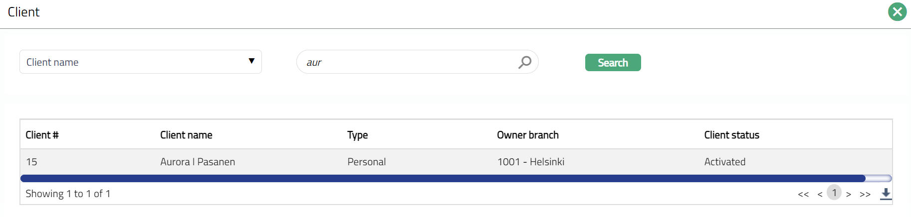 - Select the Client by clicking on client hyperlink. The Client search page appears with the list of Clients maintained under CRM > Clients > Maintain. You can search for a client with relevant criteria and select the required client. You can also input the client's name and select the required client from the list displayed by Aura.