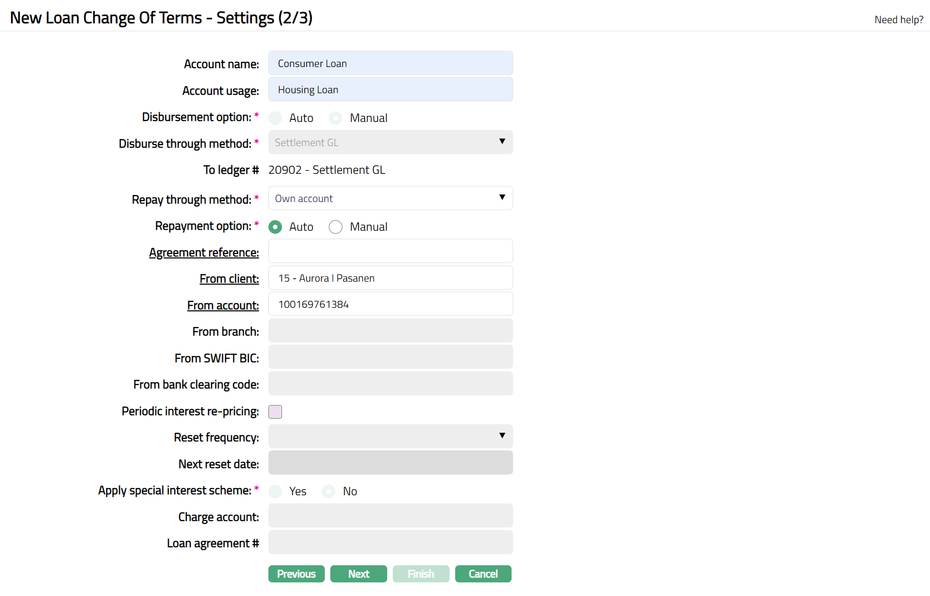 Click Next. The New Loan Change Of Terms -- Settings (2/3) page appears. The existing values for the loan account are shown as per sample below: