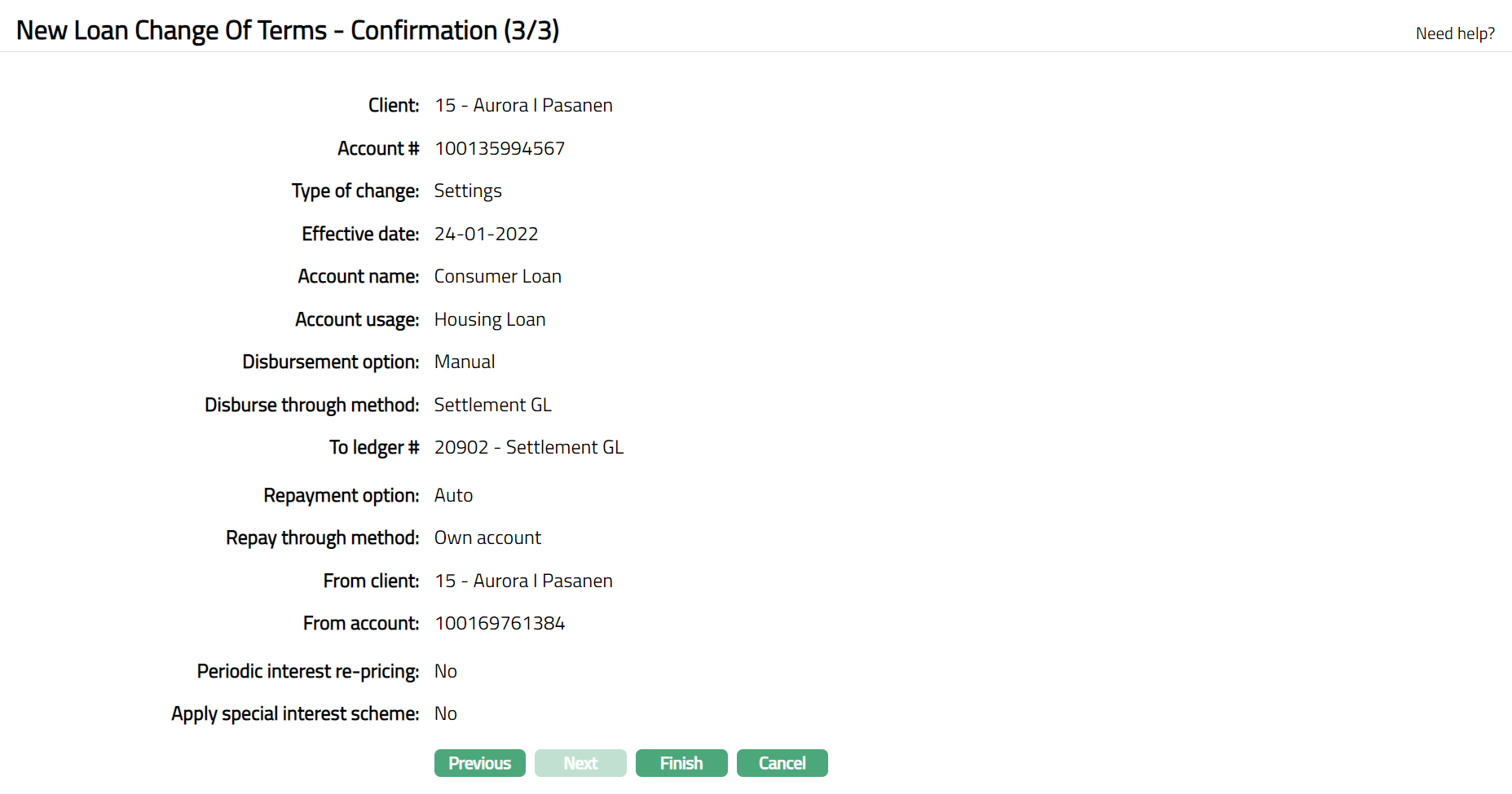 Click Next. The New Loan Change Of Terms -- Confirmation (3/3) page appears.
