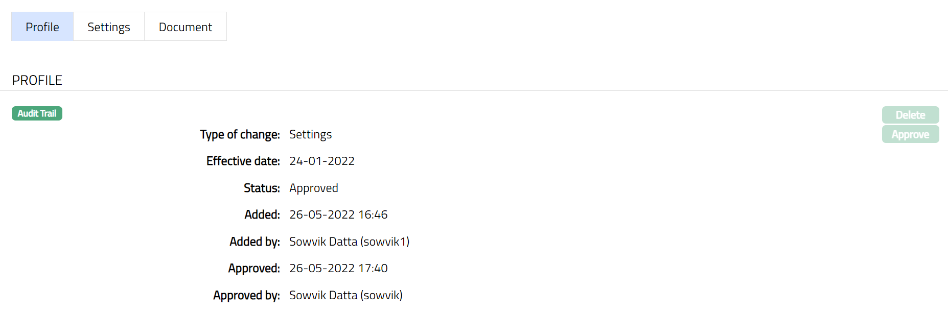- Click Delete to delete the document. Aura will ask for confirmation, on approving which the document will be deleted.