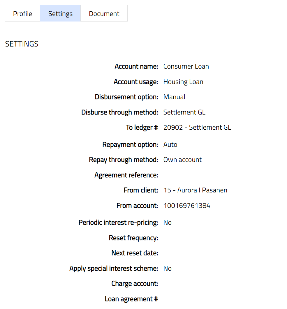 The Settings tab allows you to view and maintain certain account settings like Disbursement option, Disburse through method and Repay through method.