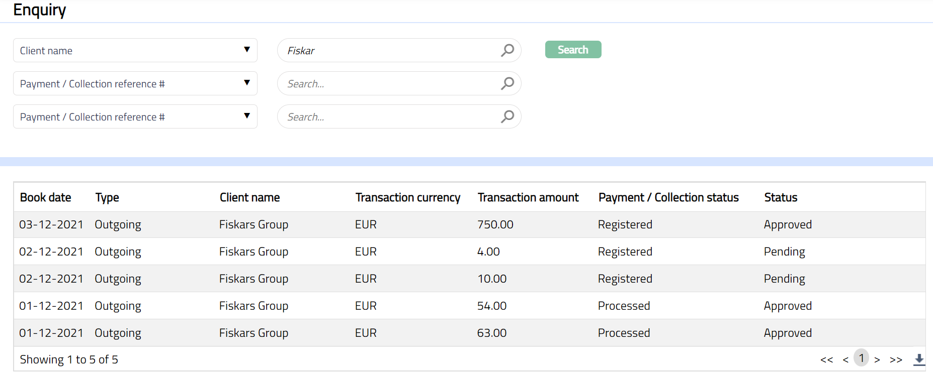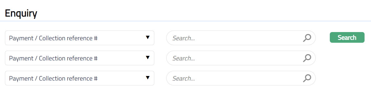 Enquiry allows you to view all the payment and collection record of type incoming, outgoing, own account transfer, other client transfer transactions.