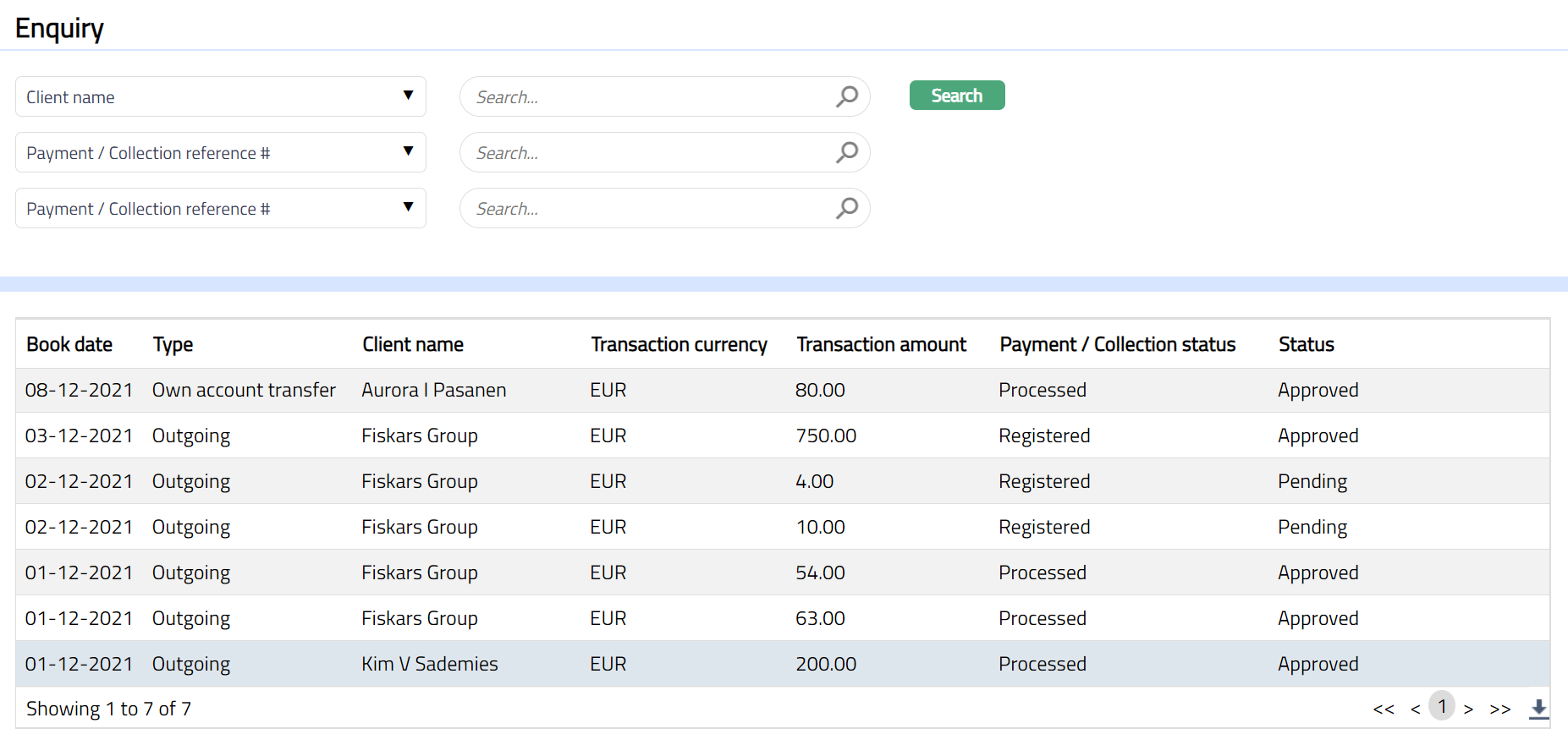 Enter an appropriate search input in the textbox provided next to the Search for dropdown, which allows a search by Account#, Book date, Client name, Payment ref #, Payment status, Payment type, Transaction status, Transaction amount, Transfer currency. For example, select Client name from the Search for drop-down and enter the Client name in the search text box. Click Search. All transactions available in Aura which satisfy the search criteria will appear on the page, as shown below: