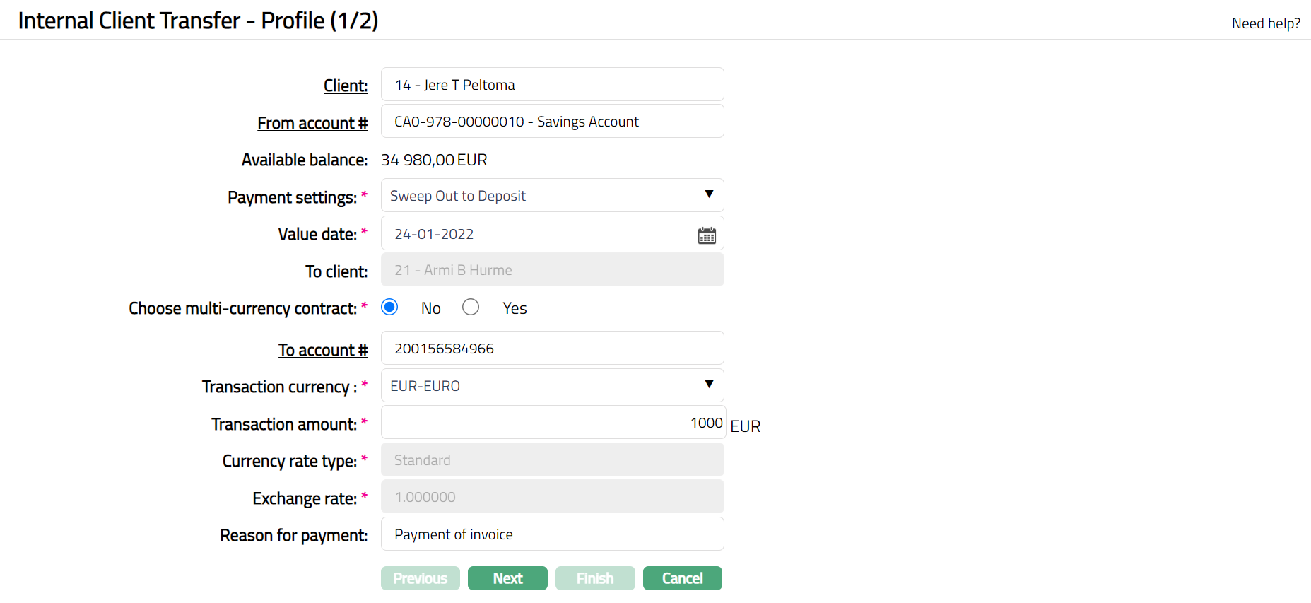 - From Retail menu access Payment, then click Net Settlement and then click Enquiry. Enquiry page appears. Click Internal Client Transfer. Internal Client Transfer page appears. Profile tab appears by default. The details are defaulted from the entries that you made during Internal Client Transfer creation. For details refer to Internal Client Transfer - Profile (1/2).