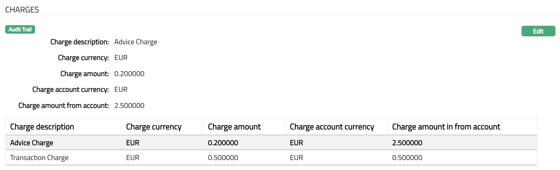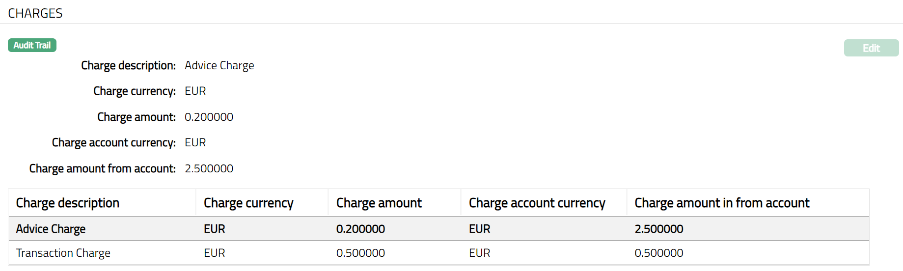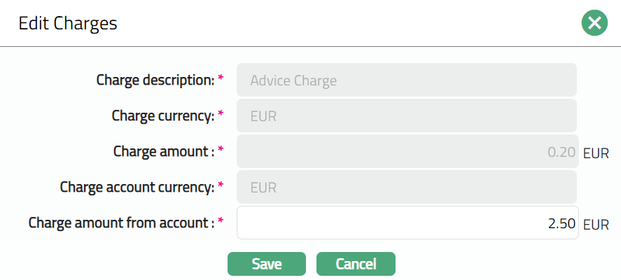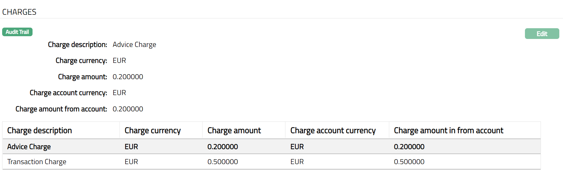 Using this tab, you can view the charge details and edit Charge amount from account.
