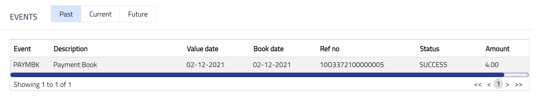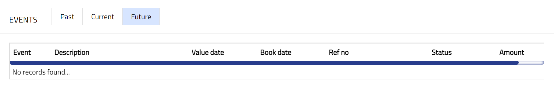 - Access Internal Client Transfer page. Click Events tab. By default, the Current tab is displayed. It shows the details of the Events that have value date = current business date. Past tab and Future tab show details of events that have value date earlier than / later than the current business date respectively.