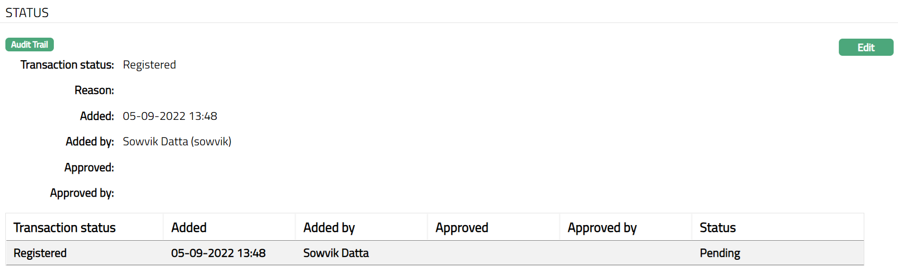 On Approval, Aura will keep the transaction status as Registered and record status will be updated to Approved