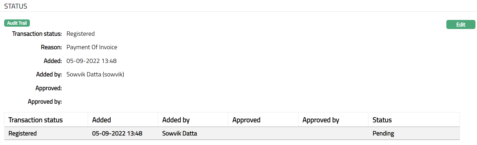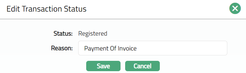 Status tab allows you to view the status of the transaction and to add a reason for it.