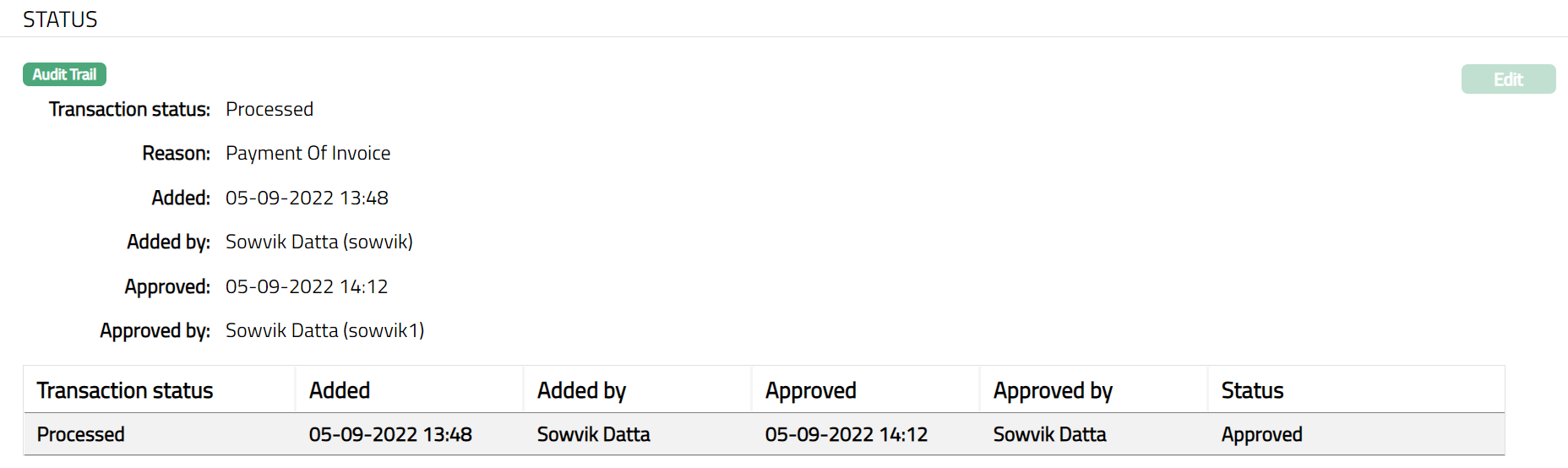 Reason denotes the reason for transaction status updates. If the Transaction status is failed, then Aura displays the reason for failure. For example: Insufficient funds, Account blocked, Debit not allowed Account dormant