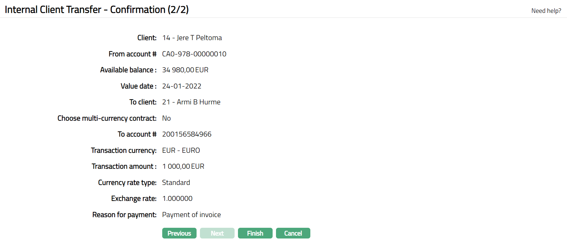 Click Next. Internal Client Transfer -- Confirmation (2/2) page appears.
