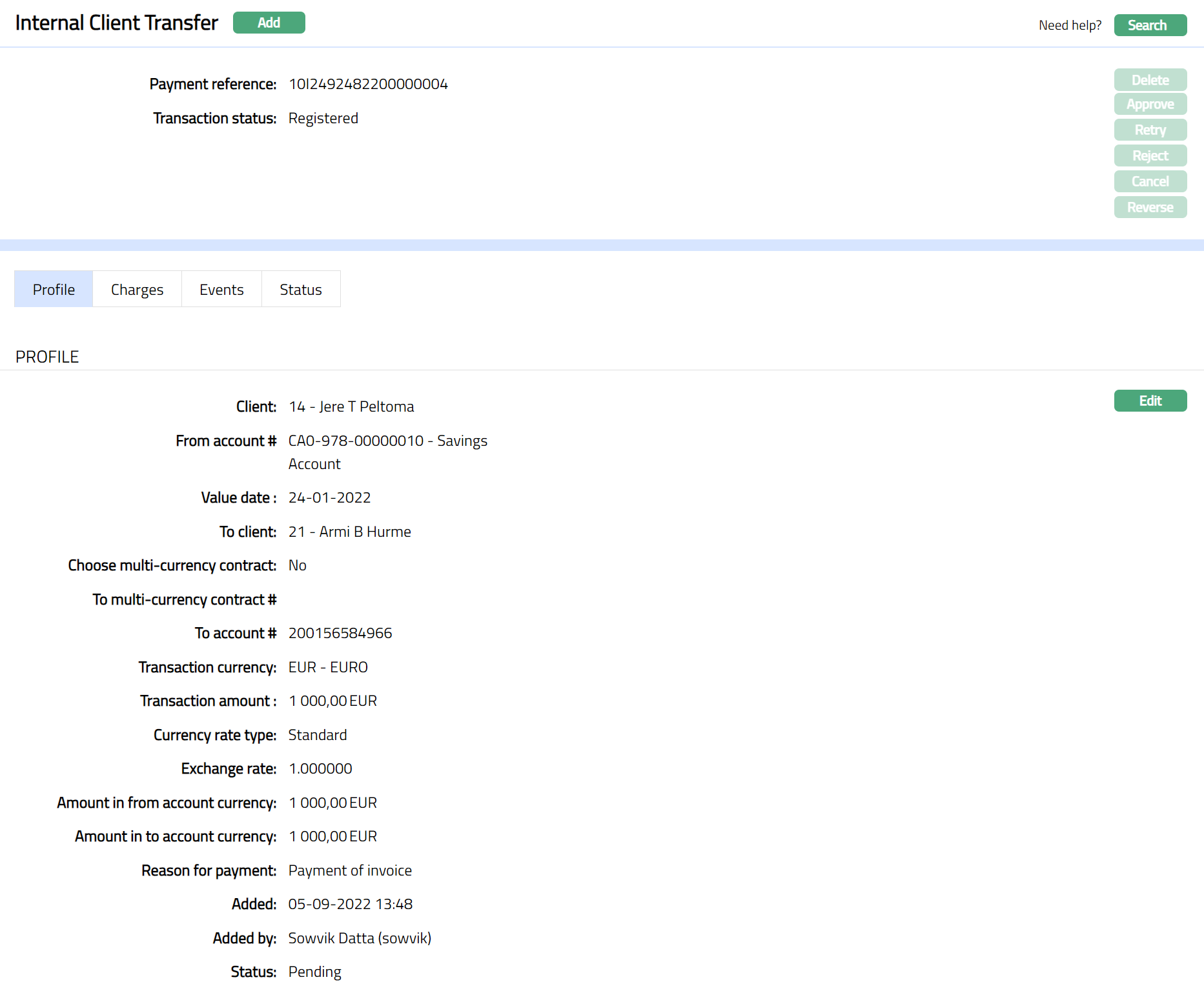 - Click Finish. Internal Client Transfer page appears with a unique Payment reference number displaying Transaction Status as Registered and Status and Status as Pending. Note: Profile page will appear by default.