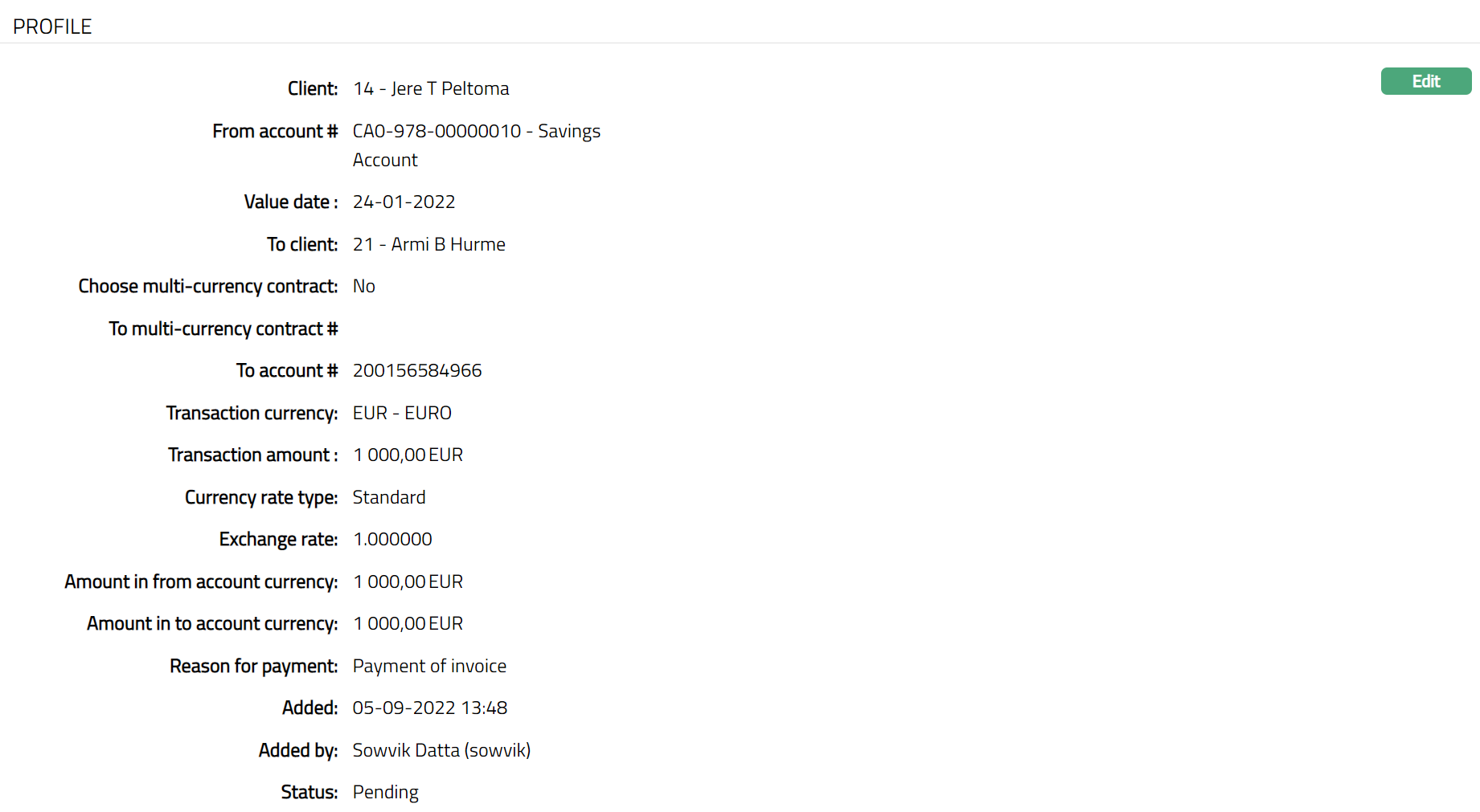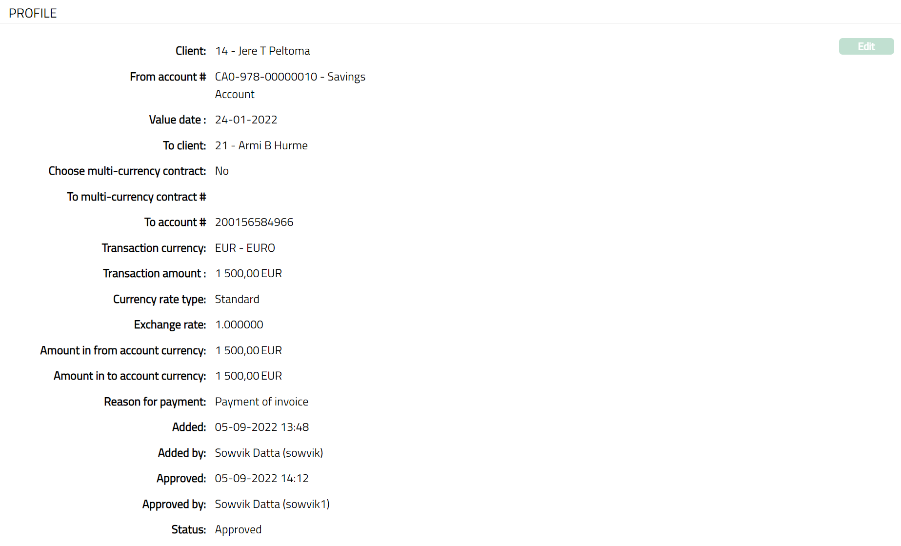 Approve: You can approve an internal client transfer record by a click on Approve button. Only users other than the one who created the record can approve the transaction.