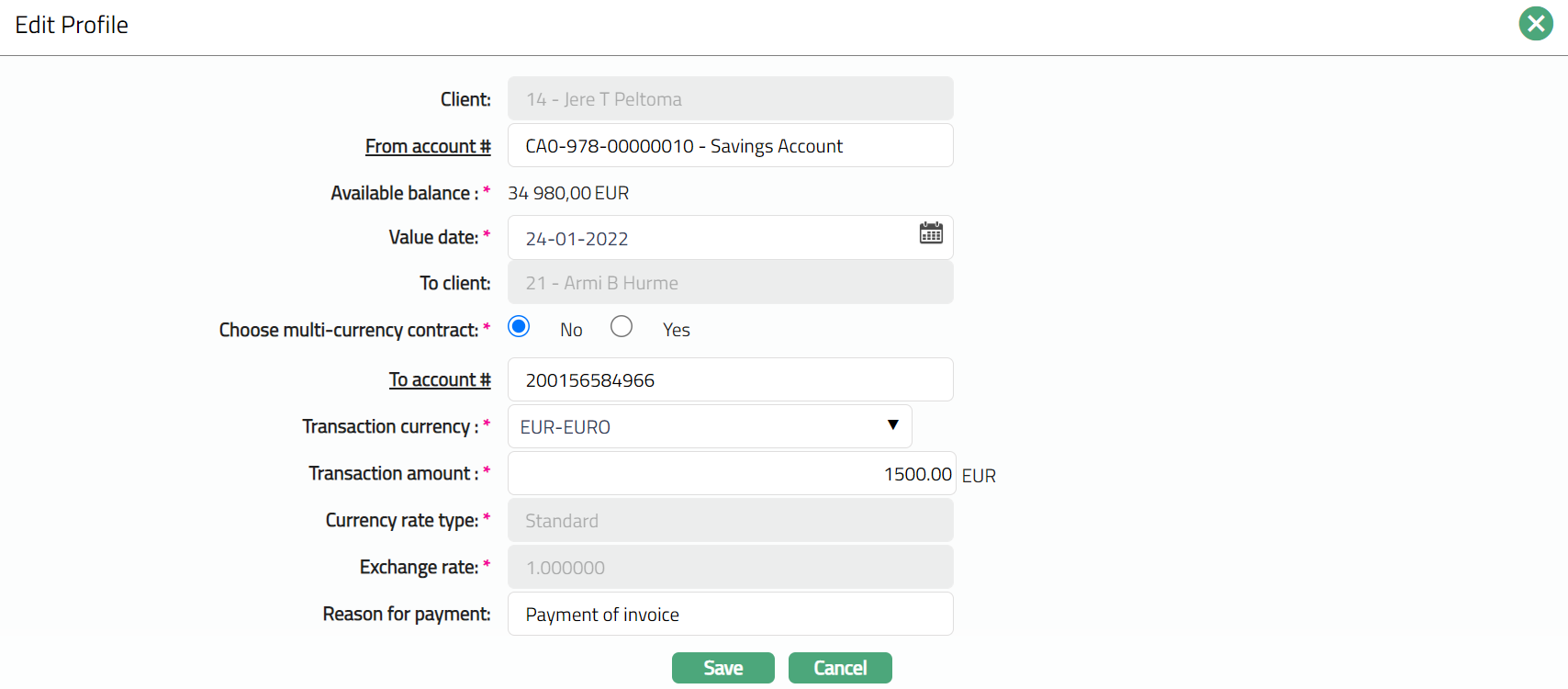 Note: Except Client, To client, Currency rate type and Exchange rate, all other fields are editable.