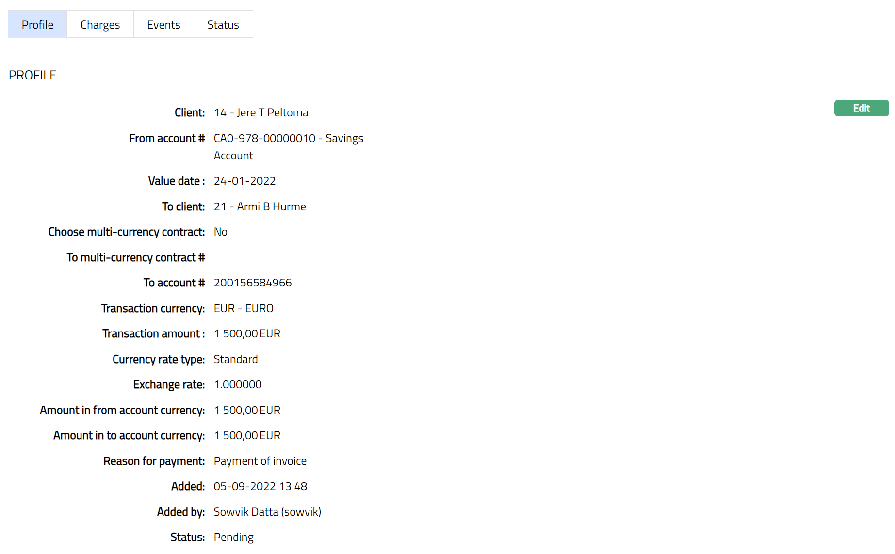 Based on Payment settings, Charges, Currency rate type, Exchange rate and Amount in From Account and To Account currencies are resolved only when value date becomes equal to current date in the future for future dated transactions and the details maintained for the selected payment setting will be applied for the transaction.