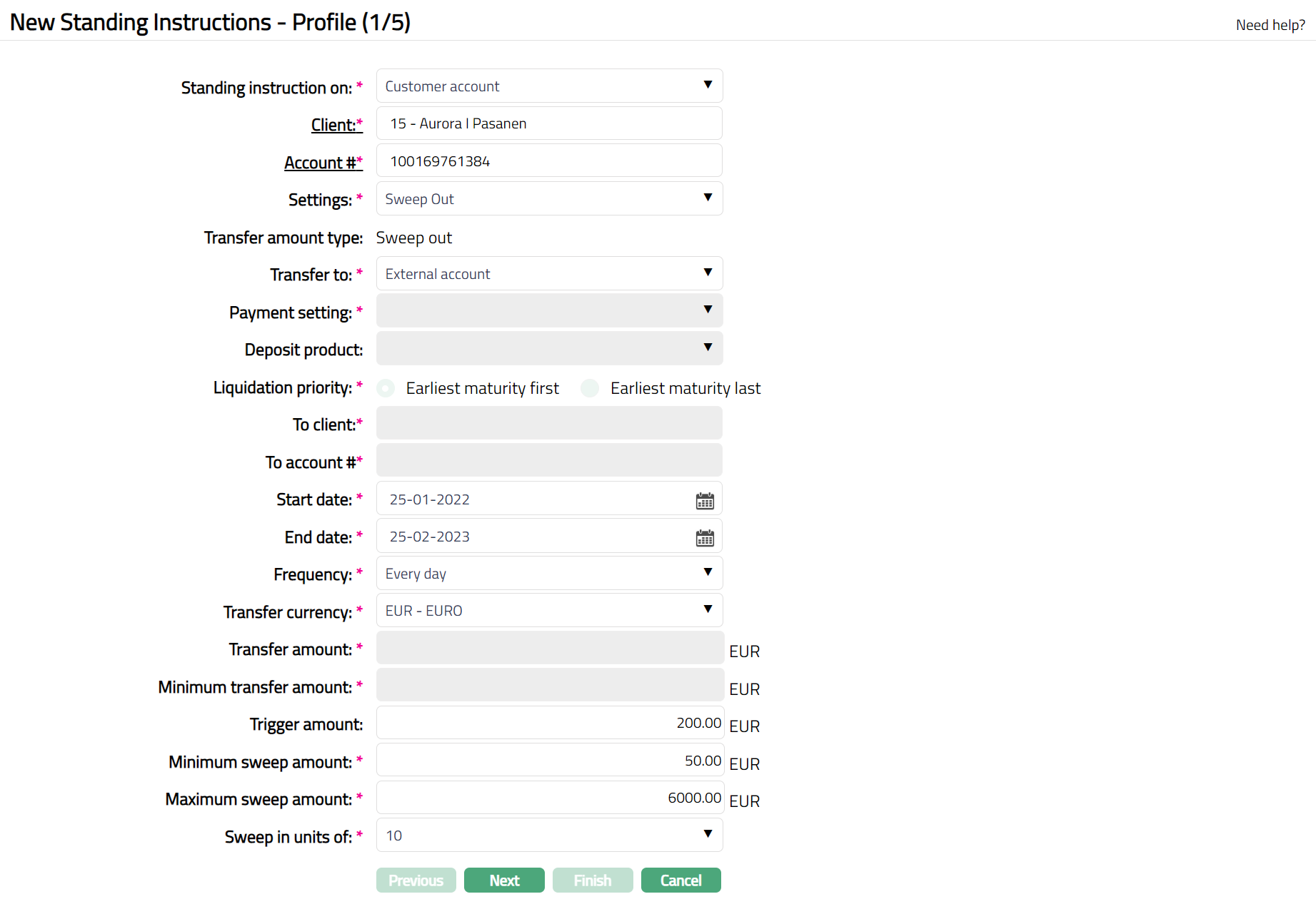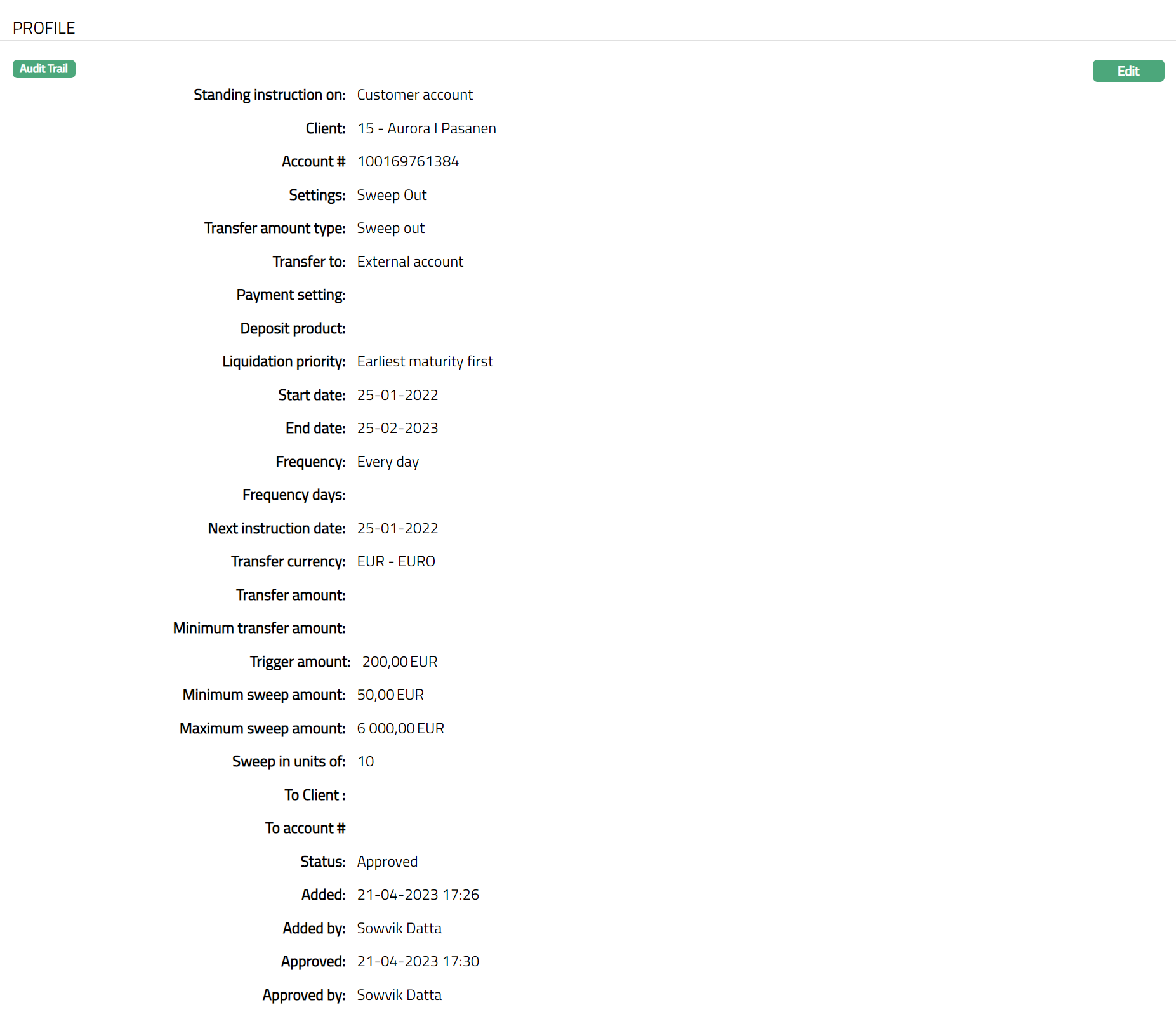 Note: Except Standing instruction on, Client, Transfer amount type, and Next instruction date all other fields are editable.