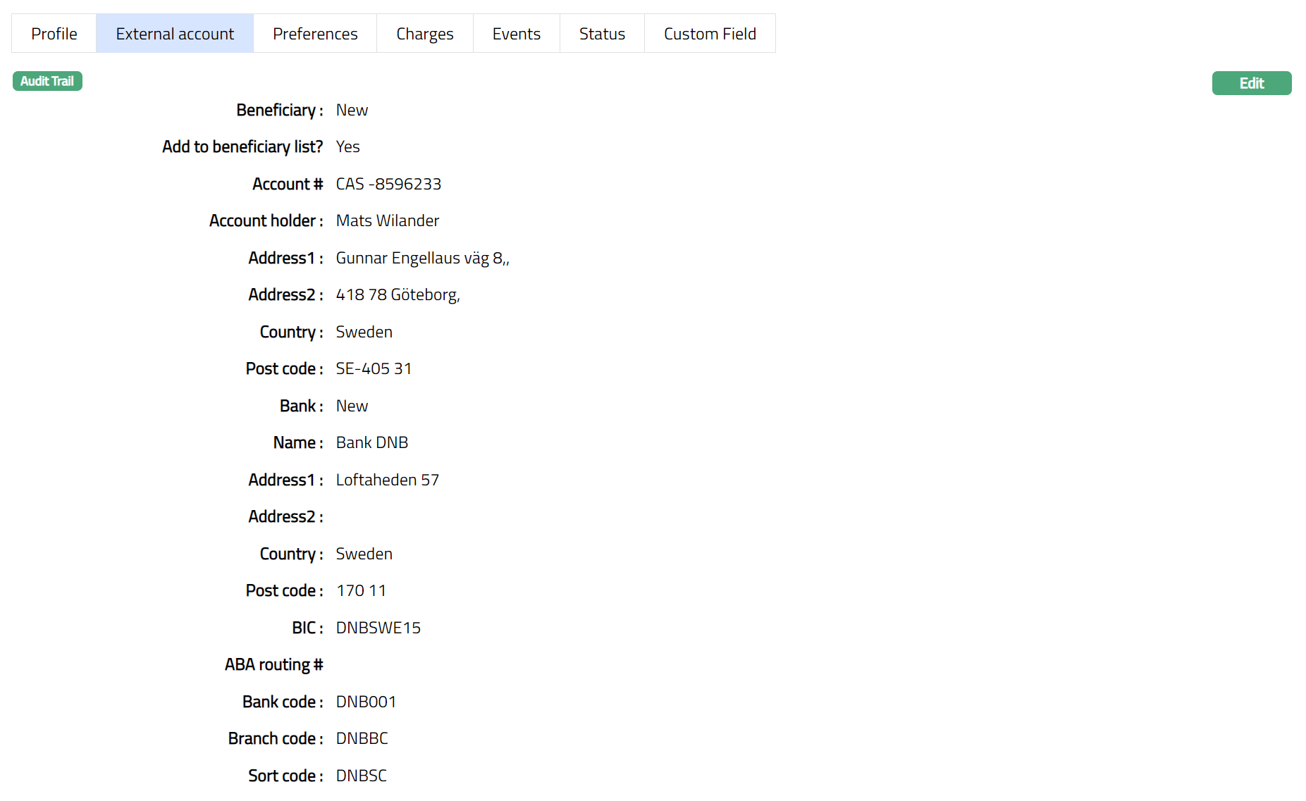 - Click Edit. Edit - External Account Details page appears.
