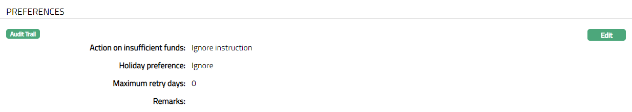 Preferences tab displays the details of preferences set for the Standing Instructions.