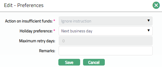 - Access Standing Instruction page. Click Preferences tab. The details are defaulted from the entries that you made during Standing instruction maintenance. For details refer to New Standing instruction -- Preferences (3/5)