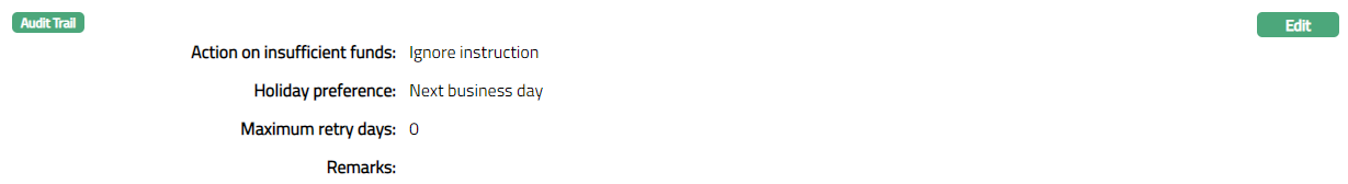 Click Maximum retry Days and fill the number of days for which the Standing Instruction should be repeatedly tried for execution in case it fails. This field is enabled only when the Transfer Amount Type is Fixed Amount and option selected in the Action on insufficient funds should be Retry for ful amount / Execute with available Fund.