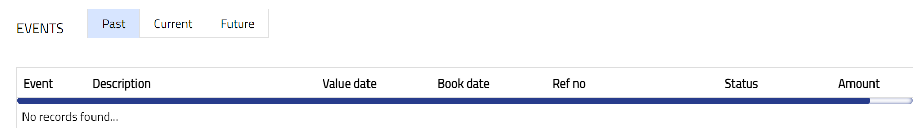 Click Event tab. There are three sub-tabs within it -- Past, Current and Future. By default, the Current tab is displayed. It shows the details of the Events that have value date = current business date. The Past tab and Future tab show details of events that have value date earlier than / later than the current business date respectively.