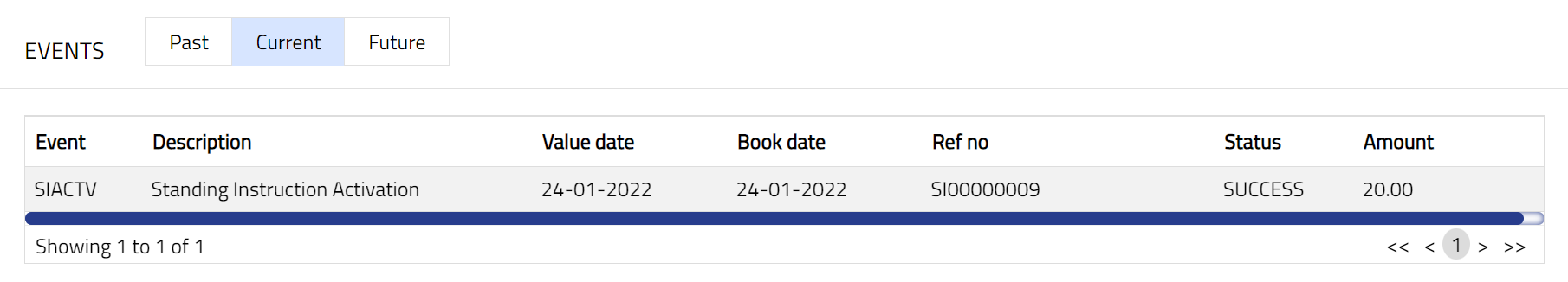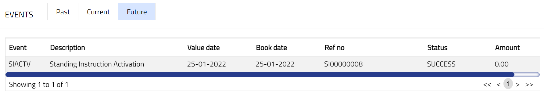 Using this tab, you can view the past, current and future events in the life cycle of the Standing Instruction.