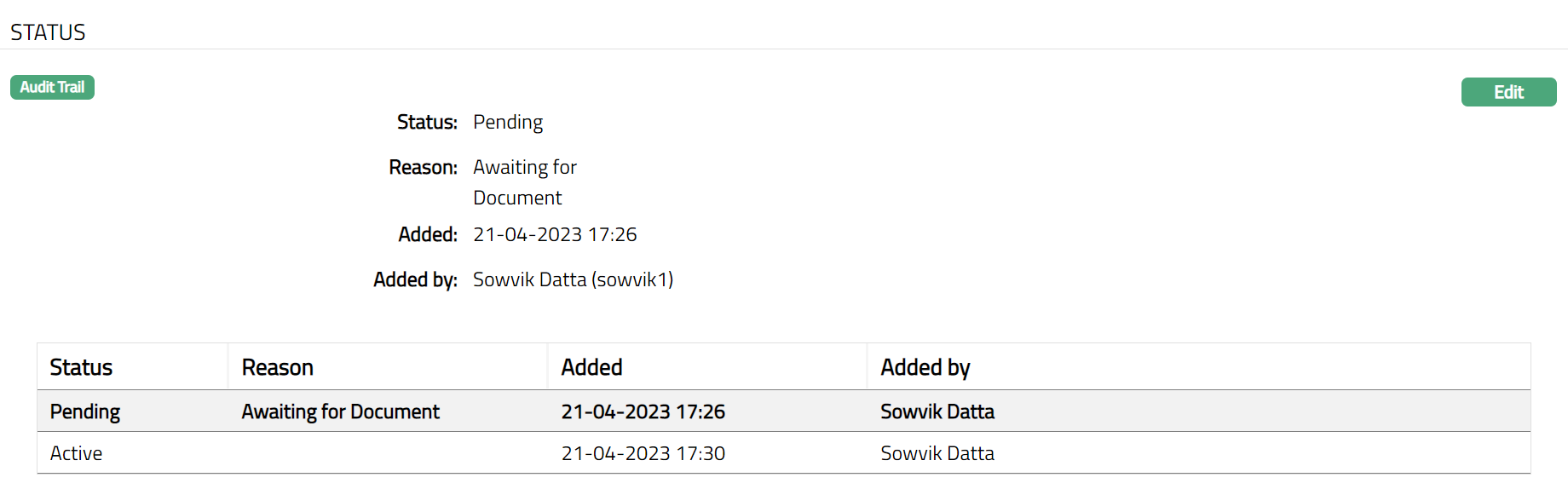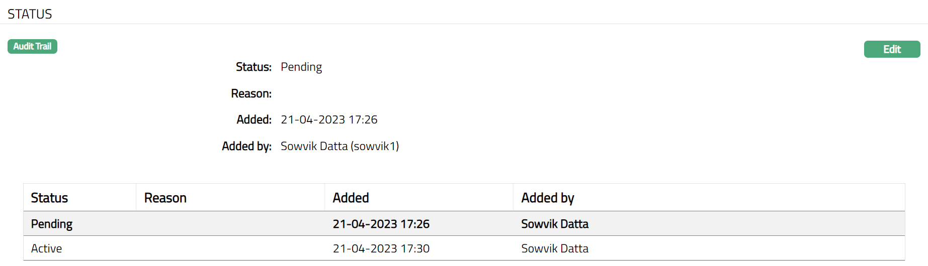 Status field denotes the status of the record -- Approved or Pending.