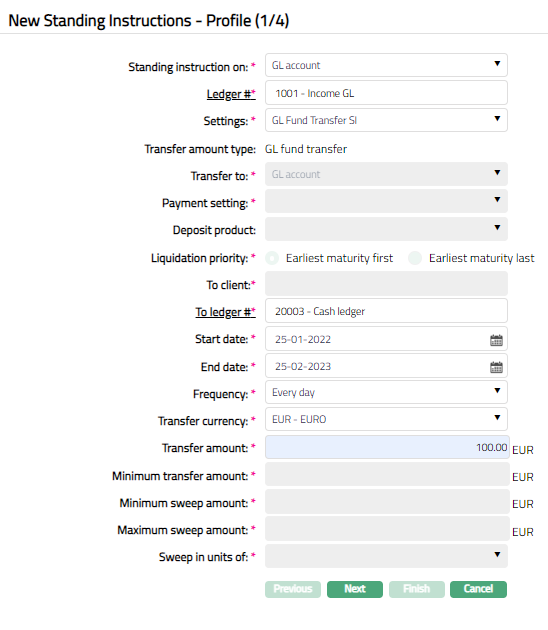 - Click Finish. New Standing Instruction is created with a unique Instruction ref#. Standing Instruction page appears, displaying Profile tab by default.