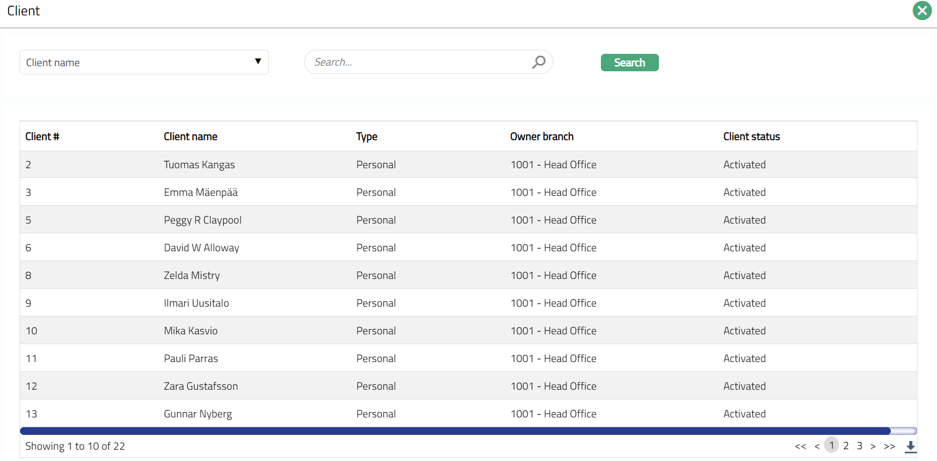 On selection of Customer account option in the above field, Client field appears with a hyperlink. Click Client hyperlink. Client search page appears with the list of clients maintained under CRM > Clients > Maintain. You can search for a client with relevant criteria and select the required client from whose account the funds have to be transferred. Alternatively, you can type in the name of the client and choose the relevant client from the list suggested by Aura.