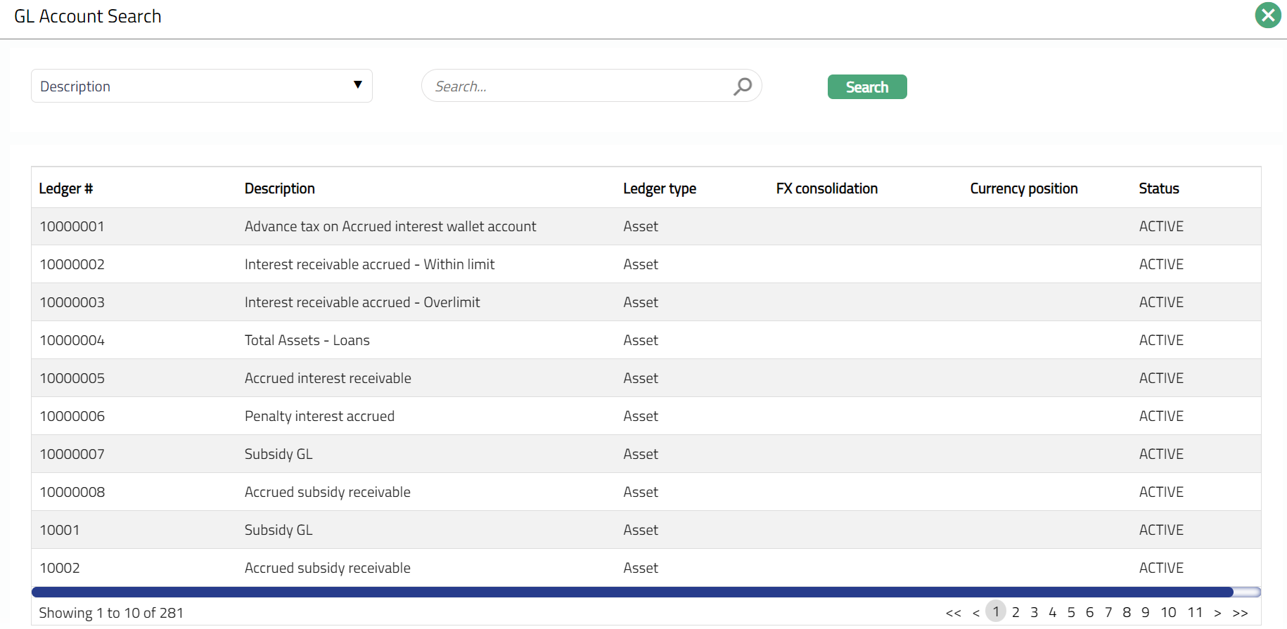If GL account option is chosen; then the Account # field gets replaced by Ledger # that appears with a hyperlink. On click on the hyperlink, GL Account search page appears with the list of all Income, Asset, Expense and Liability GL Accounts except contingent and memo GL.