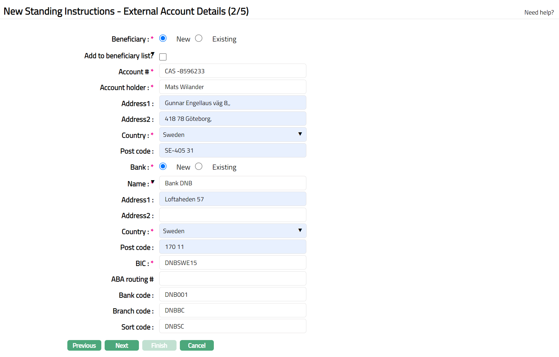 - Click Next. New Standing Instructions -- External Account Details (2/5) page appears if Transfer to is External account.