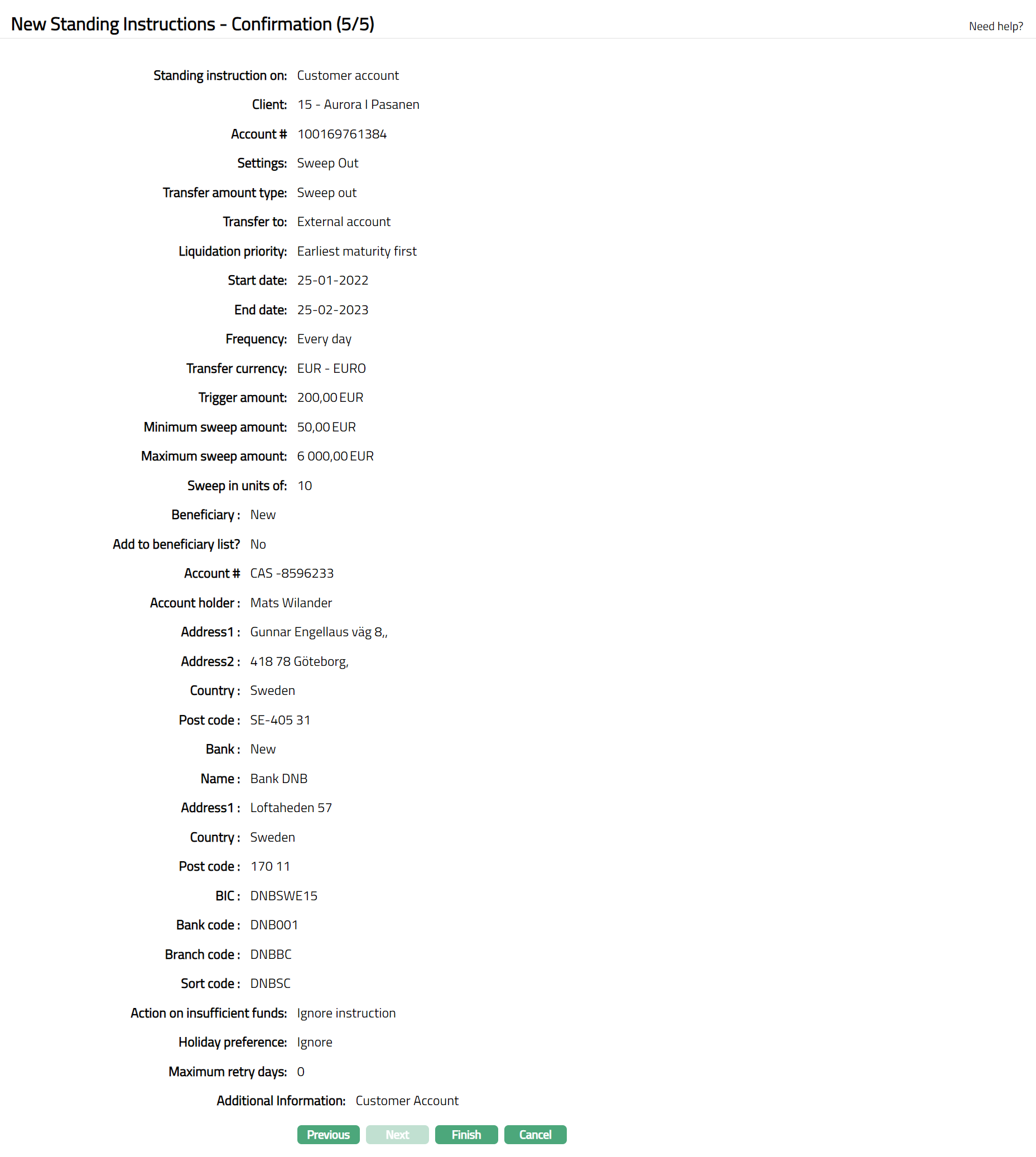 - Click Next. New Standing Instructions -- Confirmation page (5/5) appears.