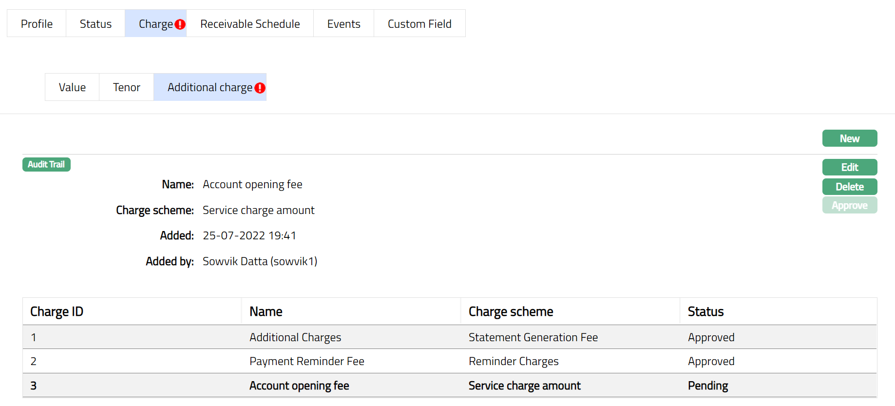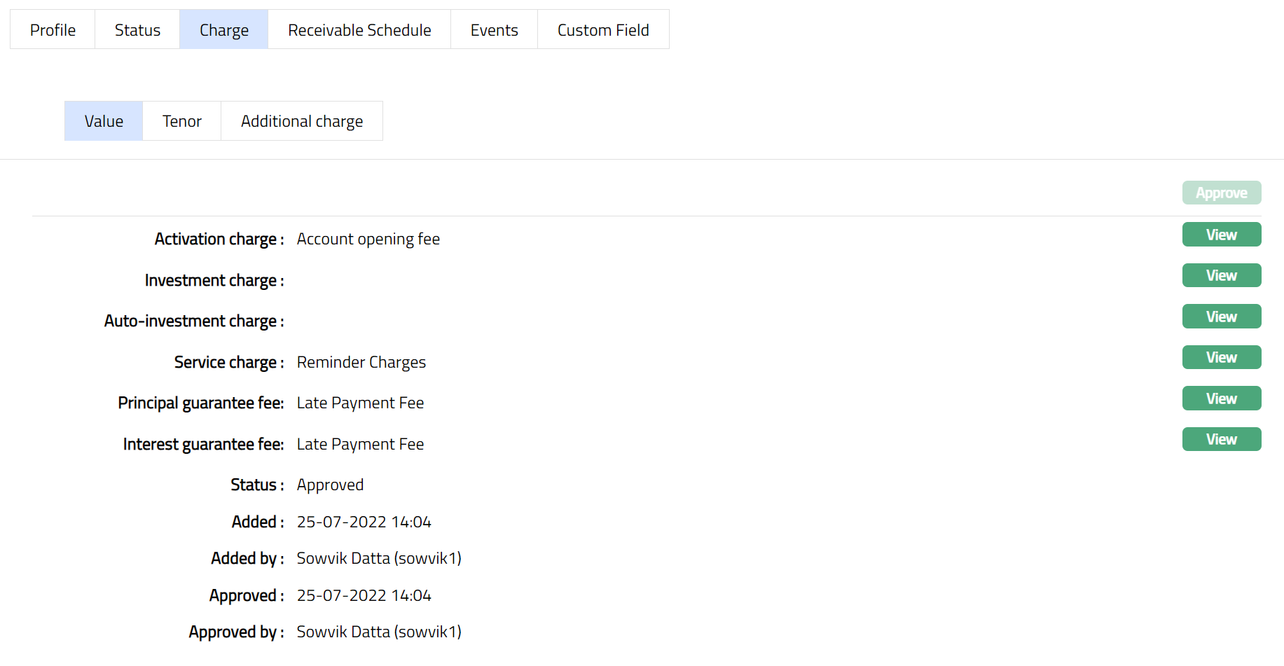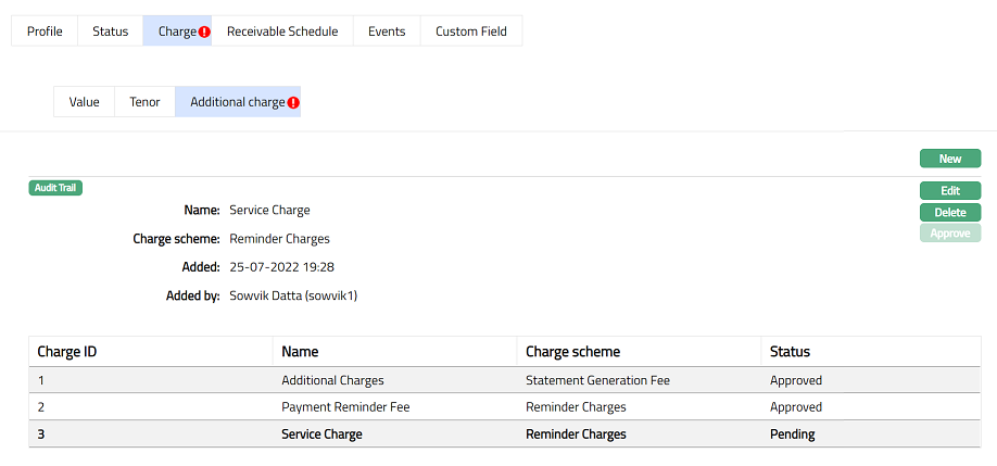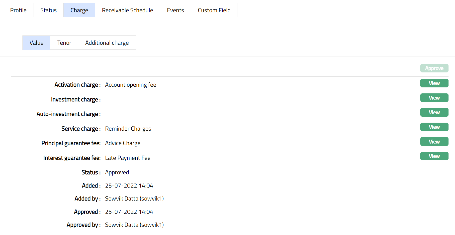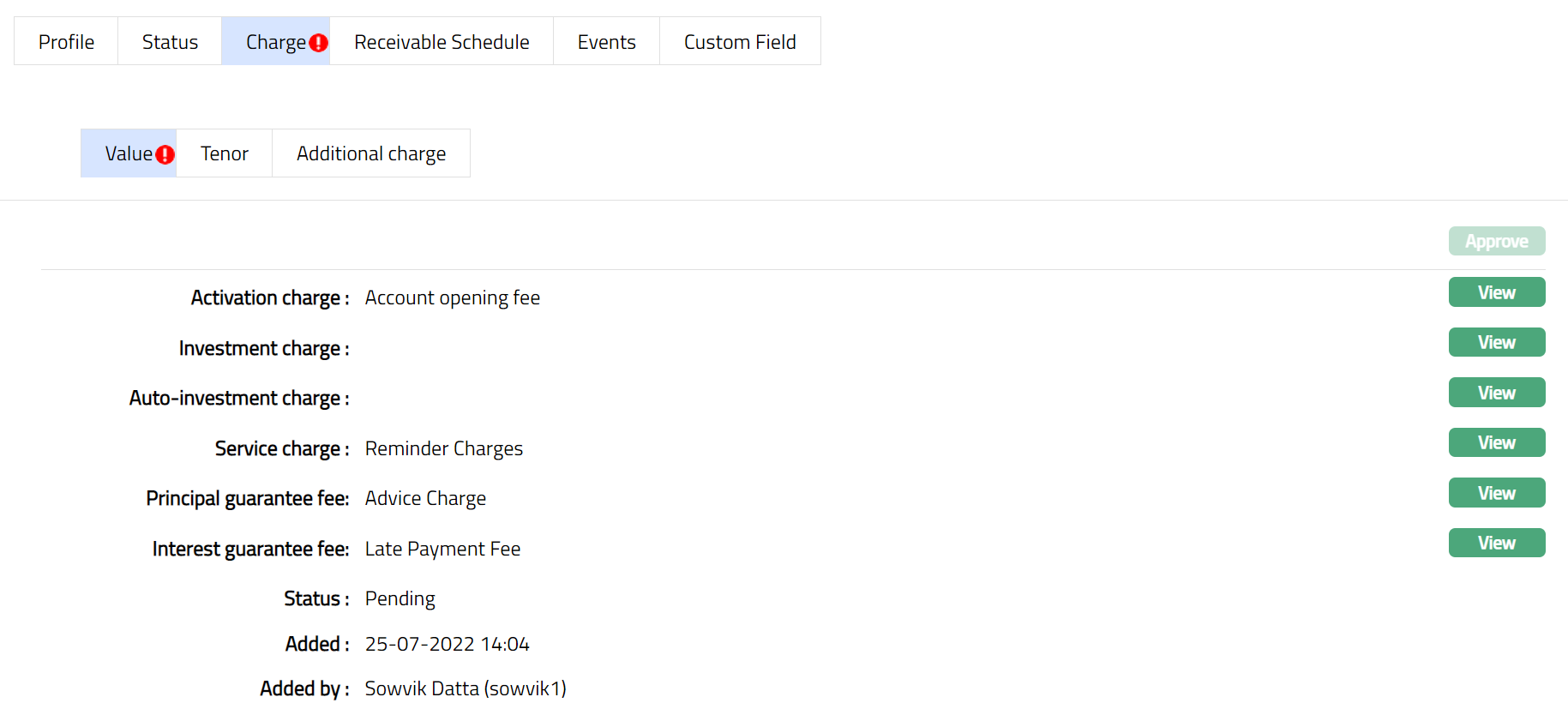 Note: After creation / edit, the status of the Value sub tab under Charge tab will be Pending till it is approved by another user. On approval, the tab status is set to Approved and the red bubble disappears.