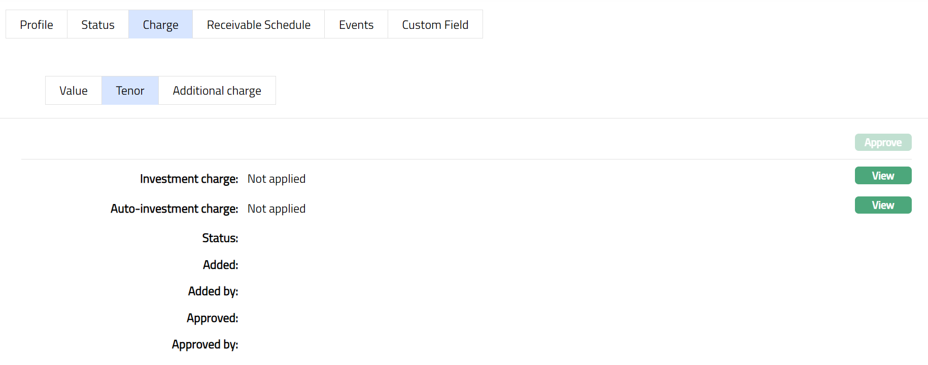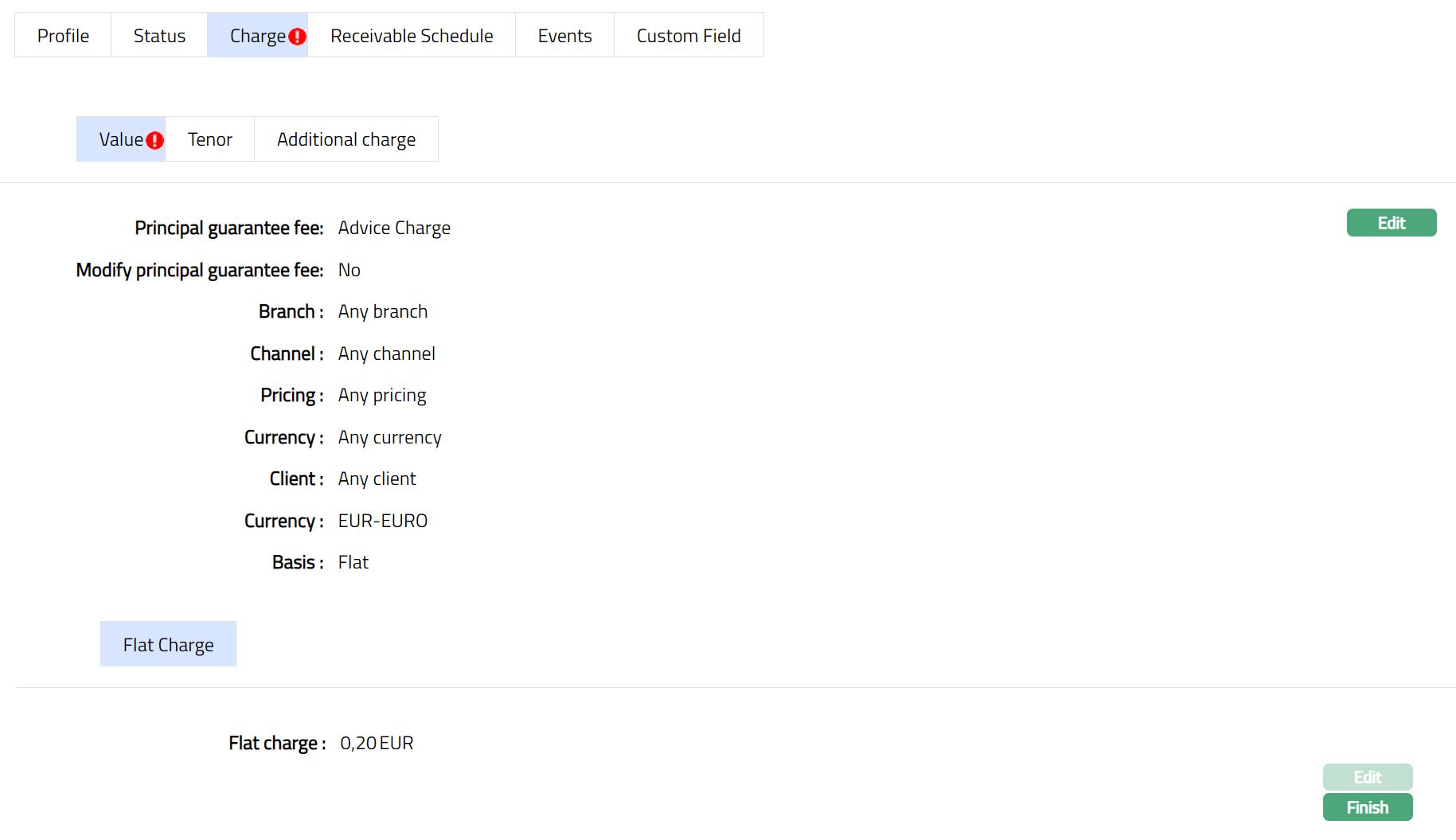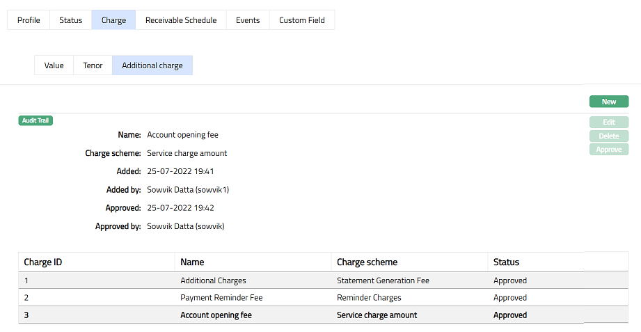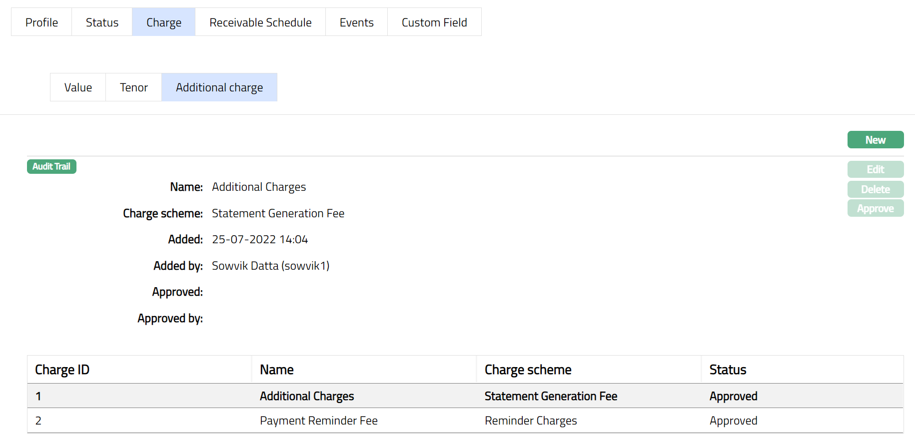Note: After creation / edit, the status of the Value sub tab under Charge tab will be Pending till it is approved by another user. On approval, the tab status is set to Approved and the red bubble disappears.