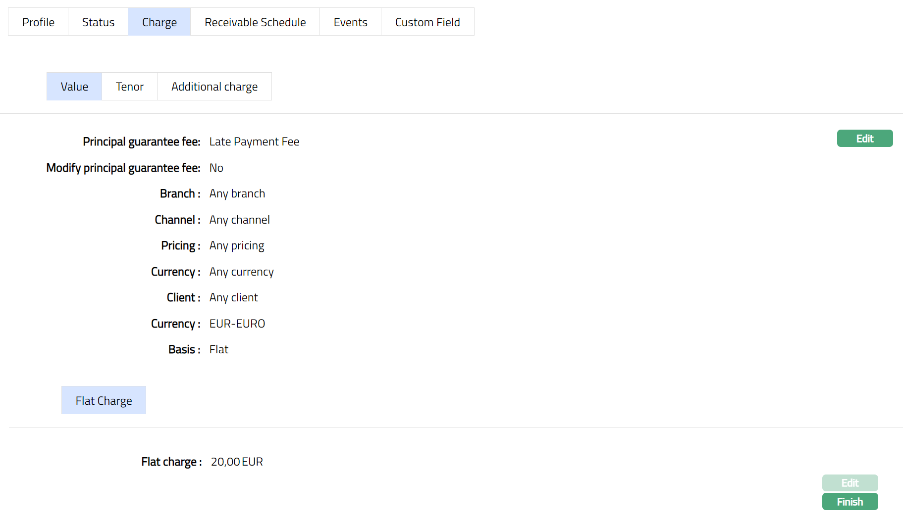 - Click Save. The Tenor sub tab page under Charge tab appears with the edited details.