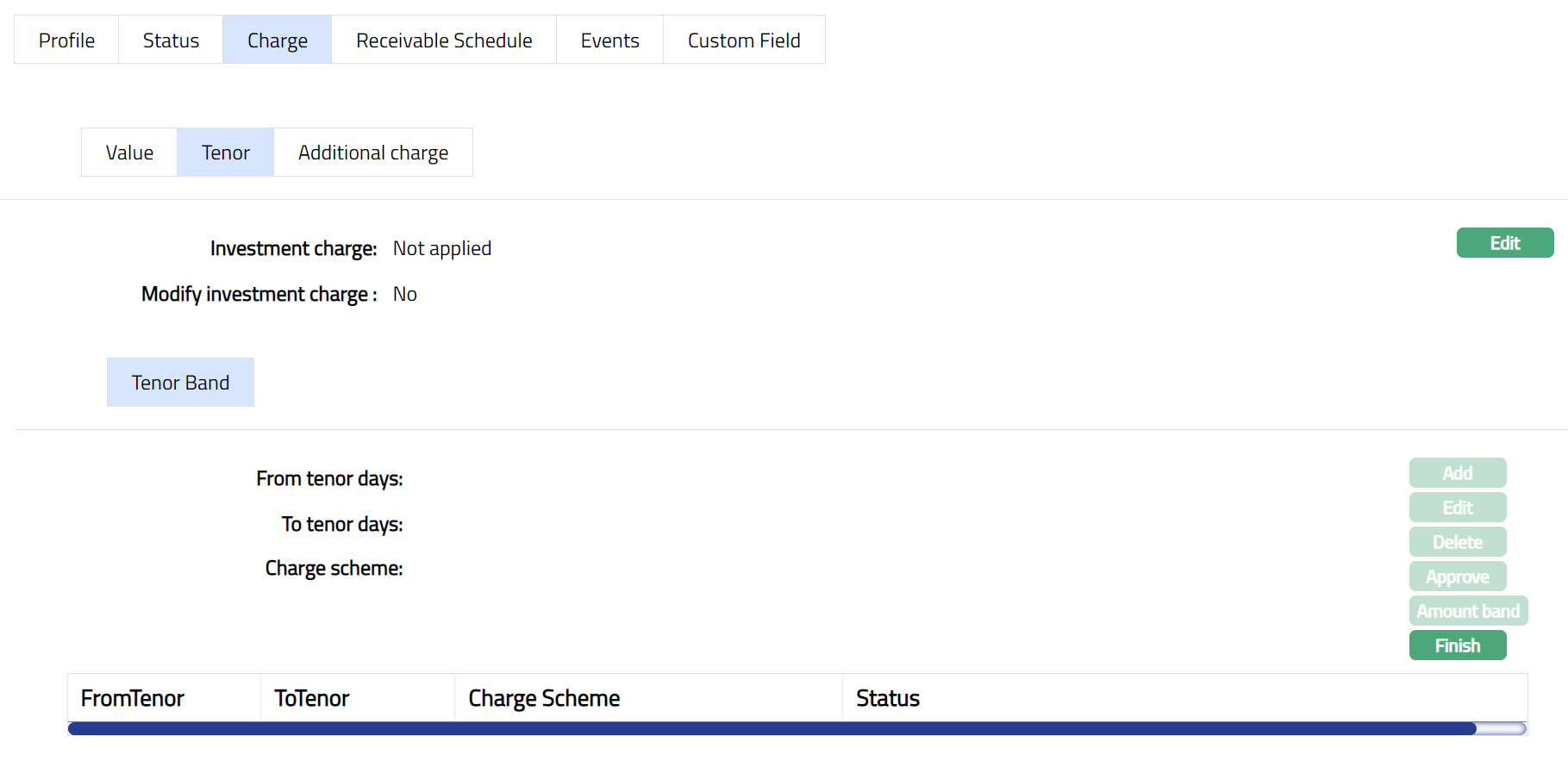 - Access Placement Instruction page. Click Charge tab and then Tenor sub tab to view the details as per sample below. On creation of Account, if there are any Tenor maintained then the same will reflect else it will be blank.