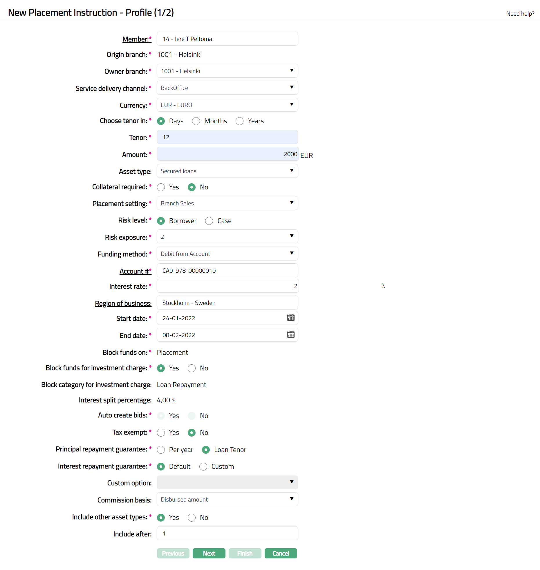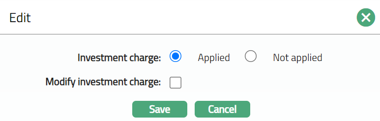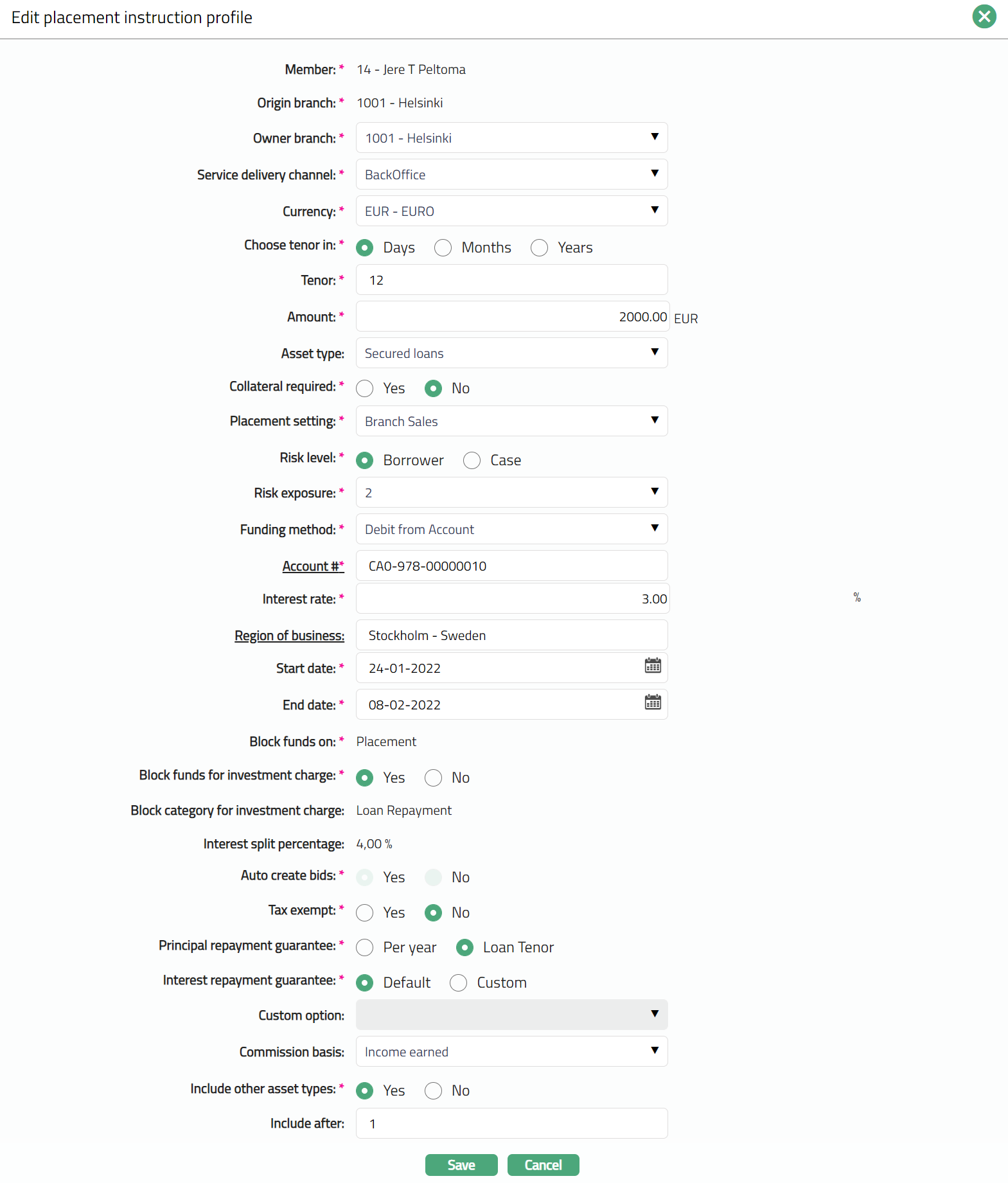 Block Funds for Investment charge indicate if funds have to be blocked also for investment charges when the lender makes a placement by selecting radio button Yes or No as required