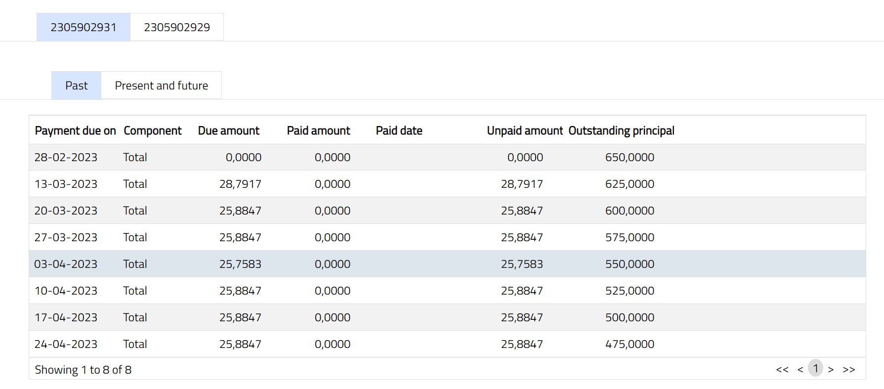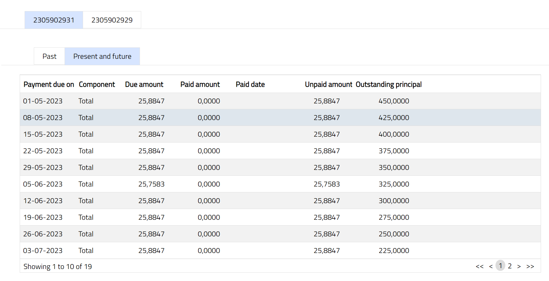 - This tab gives the details of the expected payments for the investments under this Placement Instruction. If there have been investments into multiple Loans under a single Placement Instruction, the Receivable Schedule Tab will show that many sub-tabs with the details of the receivable's schedules for each investment. As and when any Bid is rejected, withdrawn, suspended, partially accepted or expires, to that extent the Bid Block is released, and the Placement Block is incremented.
