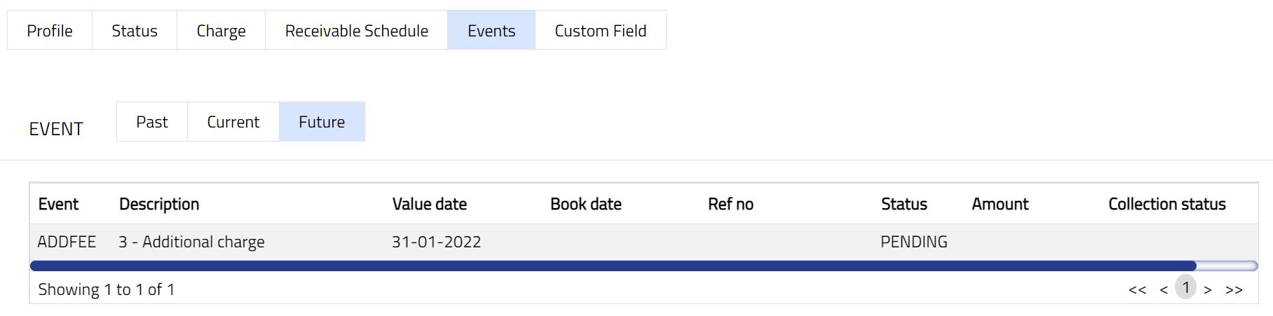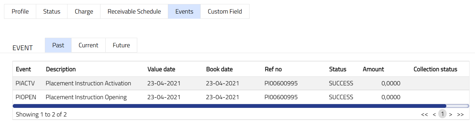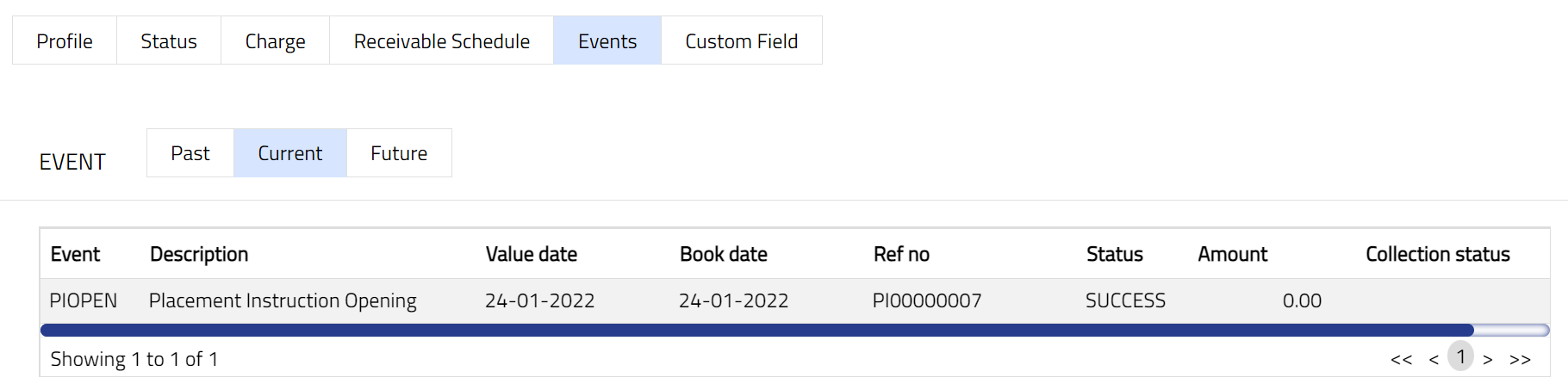 - Access Placement Setting screen then click Event tab. There are three sub-tabs within it -- Past, Current and Future. By default, the Current tab is displayed. It shows the details of the Events that have value date as current business date. The Past tab and Future tab show details of events that have value date earlier than / later than the current business date respectively. Note: If there are no event then the page will display blank as per the sample screen shot shown below.