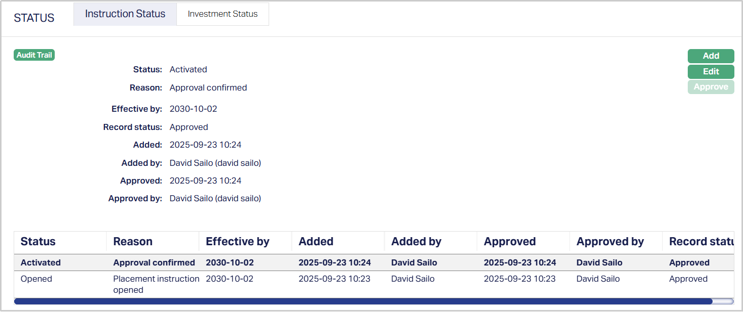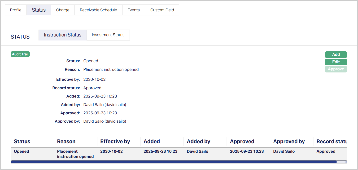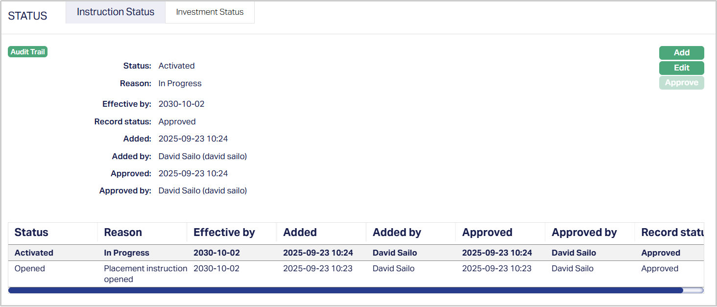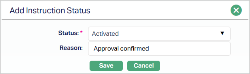 Note: Status will reflect as Activated and the Record Status will reflect as Approved. After Approval, the Instruction Status can no longer be edited.