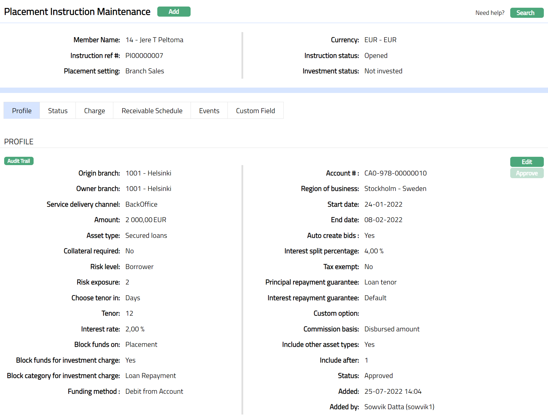 - Access Placement Instruction page. Click Profile tab to view the details as per sample below. The details are defaulted from the entries that you made during Placement Instruction creation. For details refer to New Placement Instruction -- Profile (1/2)