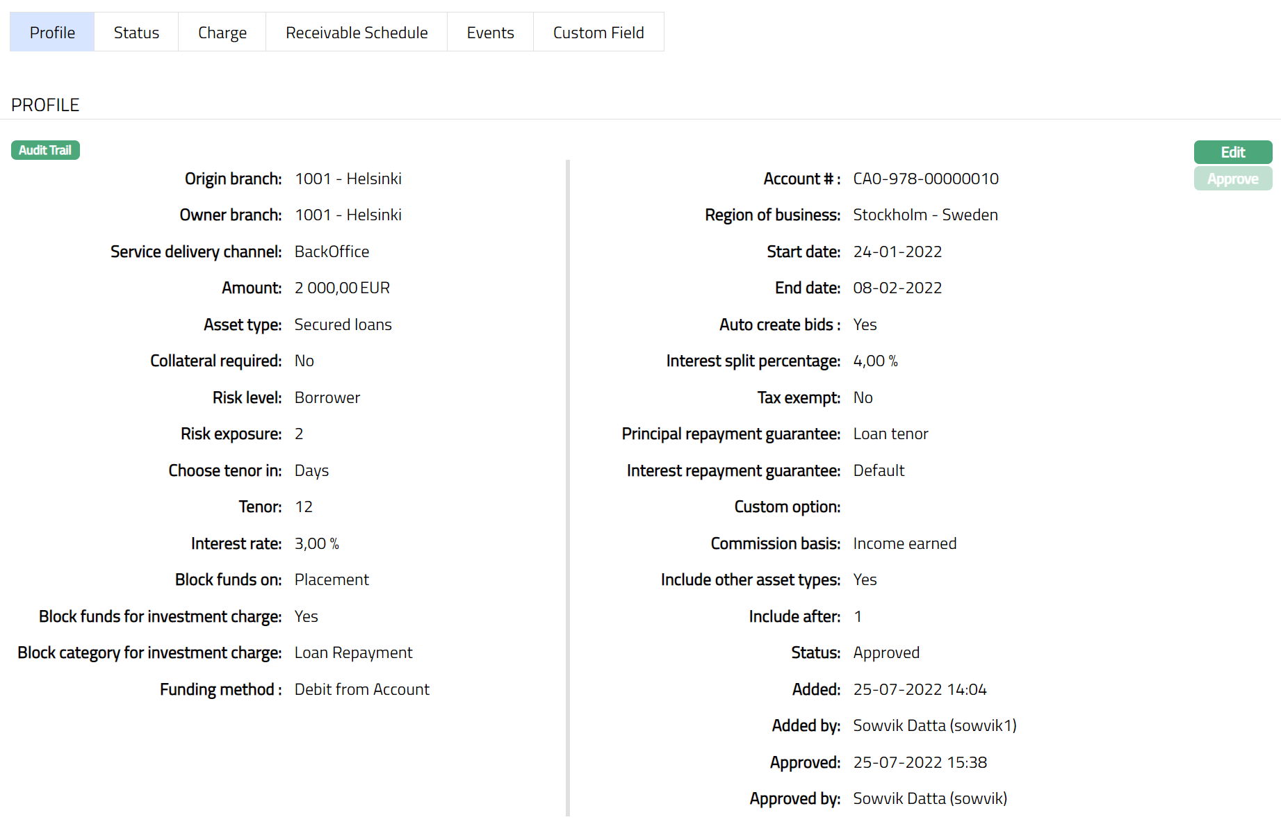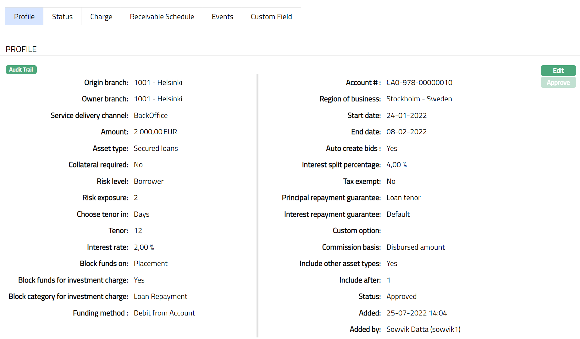 Note: After edit, the Profile tab will reflect as Pending. To approve, a user different from the one who created / edited has to retrieve the record and click Approve. Once the tab is approved the red bubble disappears and the Status changes to Approve and the red bubble disappears as shown below.