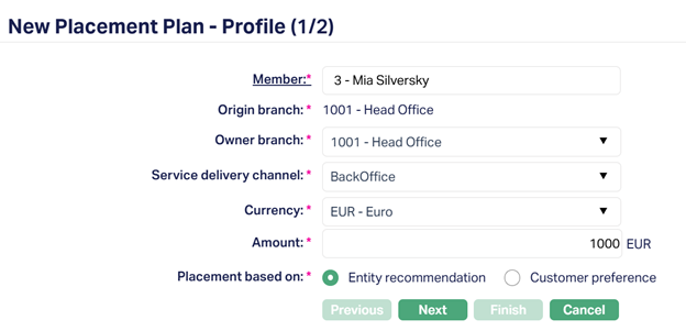 In Placement based on, select whether the Placement Plan would be based on Entity recommendation or Customer preference by selecting one of the two radio buttons.