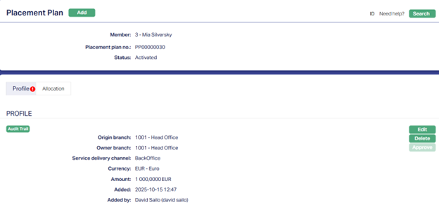 Note: You can only Edit the Profile of those Placement Plans whose Record Status are Pending. After Approval by a different user, the Profile can no longer be edited.