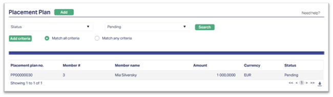 The maintenance page of the new Placement Plan appears, with a unique auto-generated Placement plan no., the Placement Plan Status as Activated and the Record Status as Pending.
