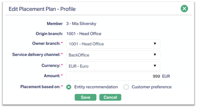 - If Placement Based On = Customer Preference: The Asset Allocation will be defaulted from the details specified and maintained under CRM > Clients > Marketplace Investment Preferences. If relevant details are not available, an error message will be displayed.